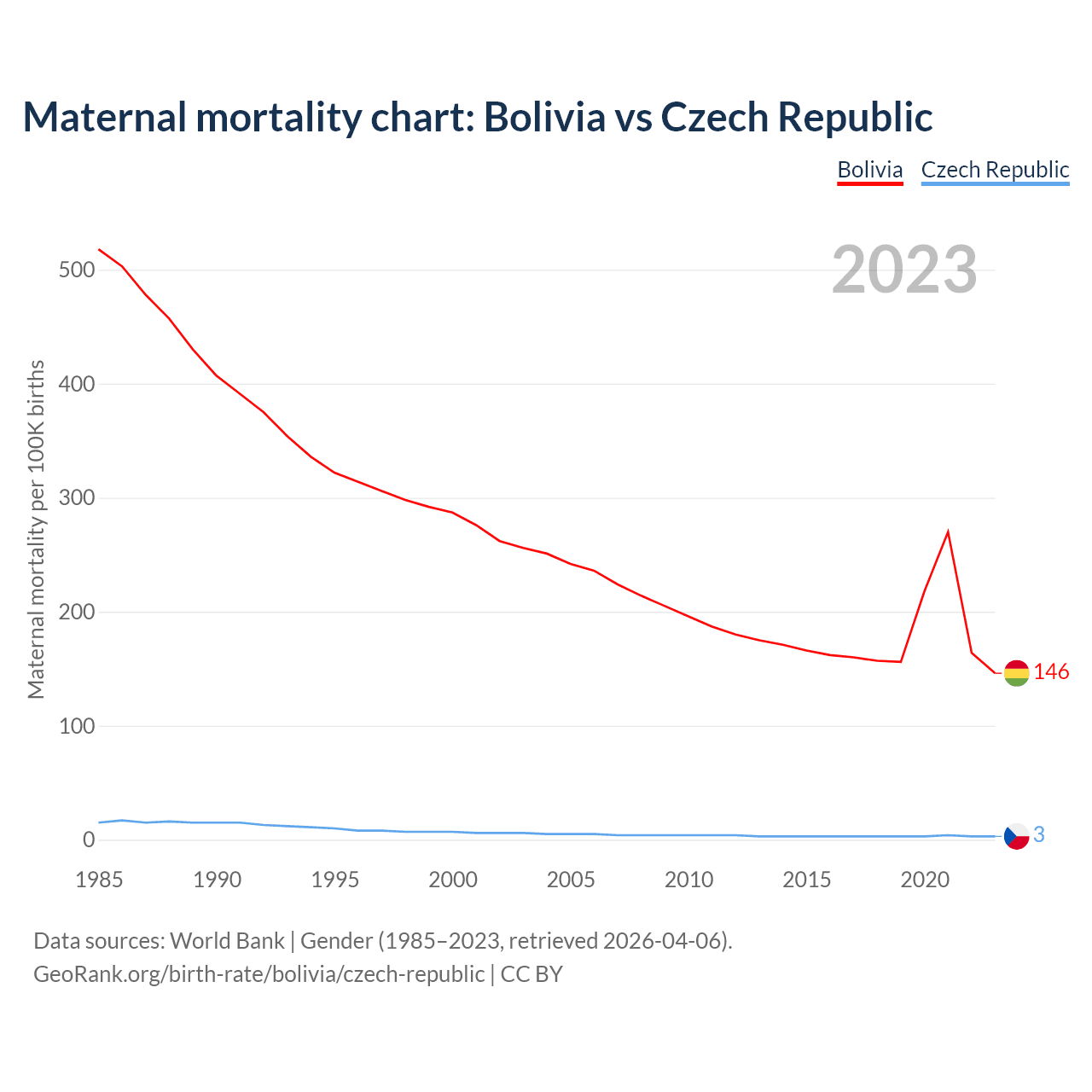 The maternal mortality rate, which is the probability of dying during childbirth or within 42 days of pregnancy termination, is 146 deaths per 100,000 live births in Bolivia, compared to 3 deaths in the Czech Republic.