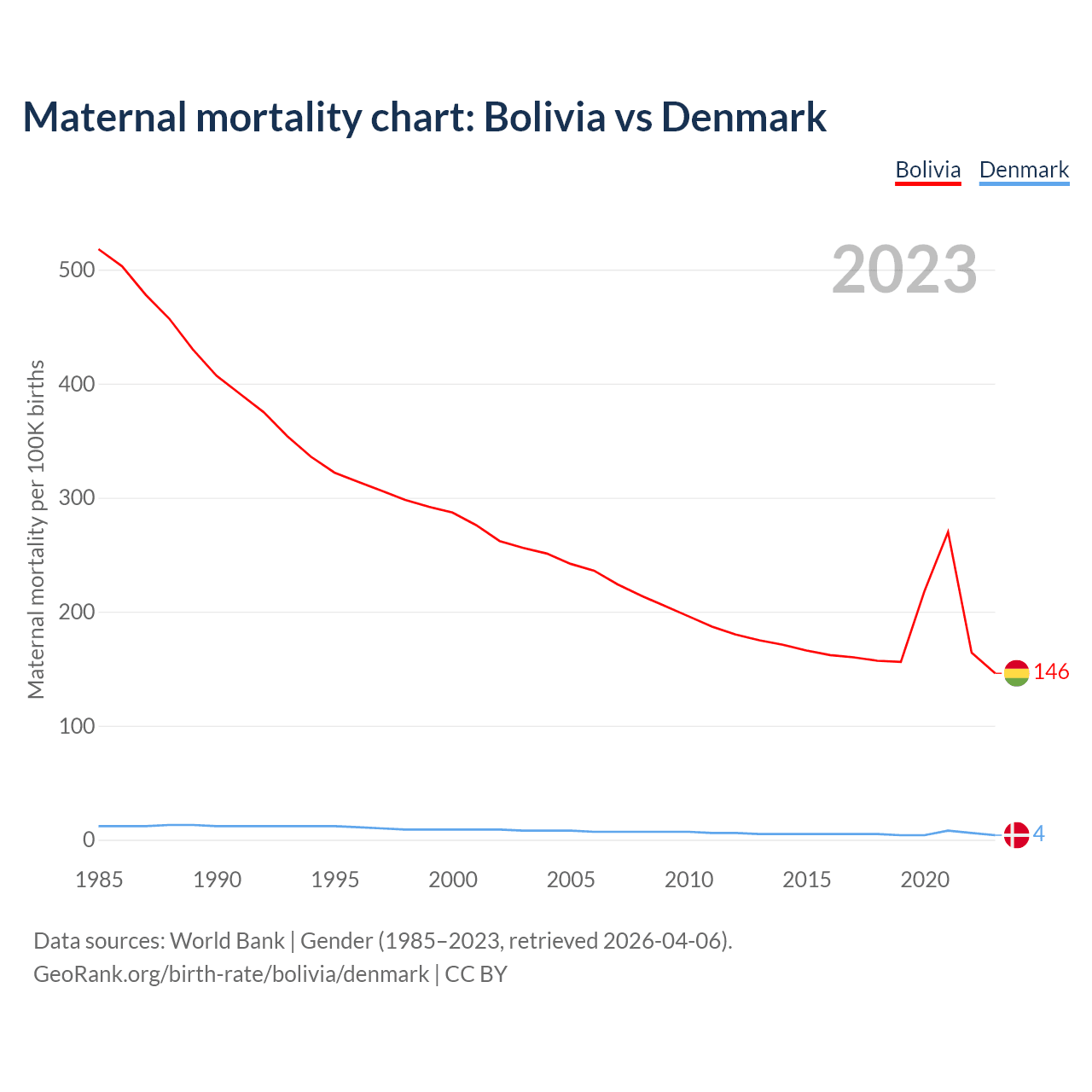 The maternal mortality rate, which is the probability of dying during childbirth or within 42 days of pregnancy termination, is 146 deaths per 100,000 live births in Bolivia, compared to 4 deaths in Denmark.