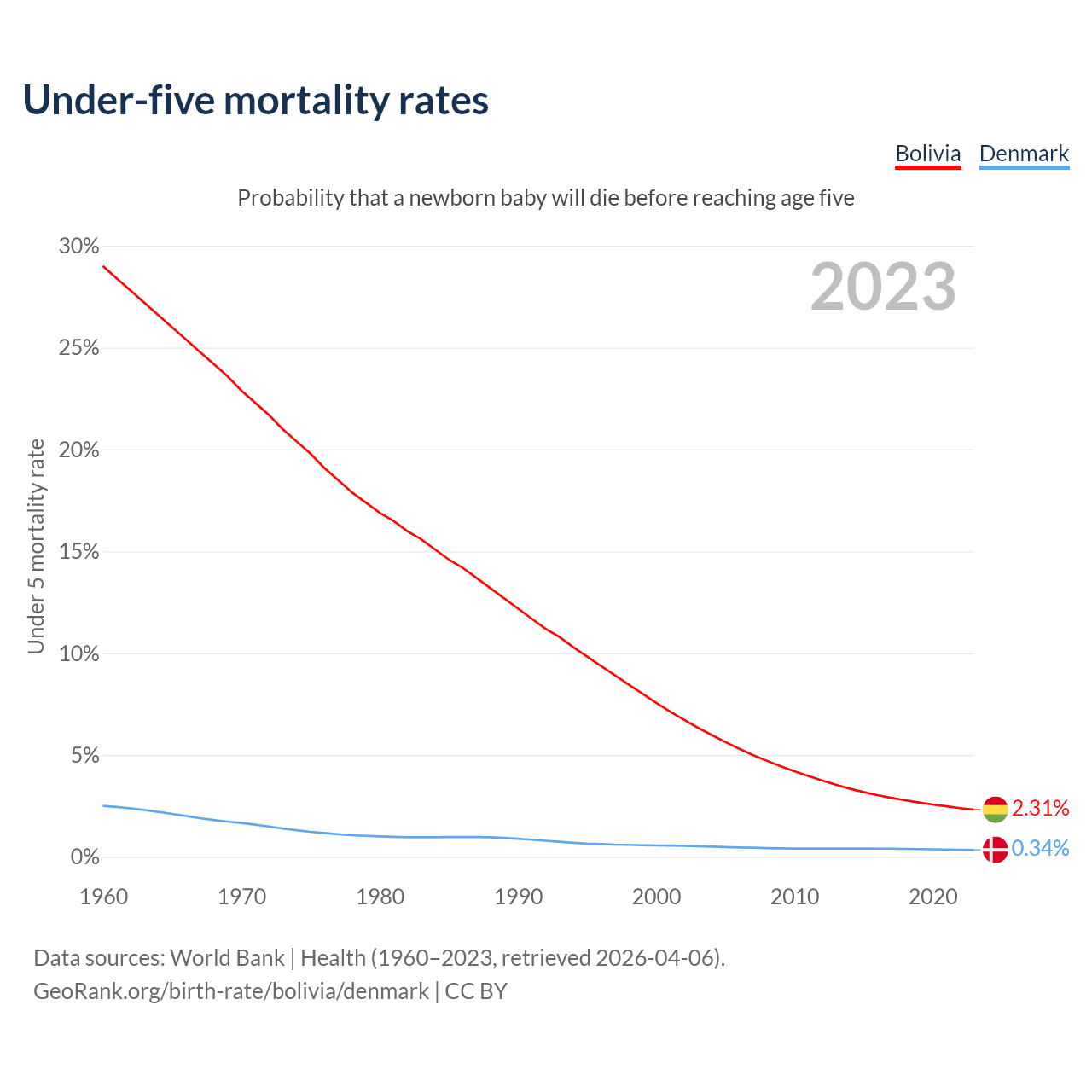 The chance that a newborn baby will die before reaching age five is 2.31% in Bolivia and 0.34% in Denmark. Above is a chart with historical data on under-five mortality rates.