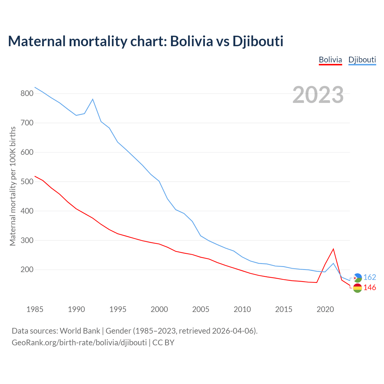 The maternal mortality rate, which is the probability of dying during childbirth or within 42 days of pregnancy termination, is 146 deaths per 100,000 live births in Bolivia, compared to 162 deaths in Djibouti.