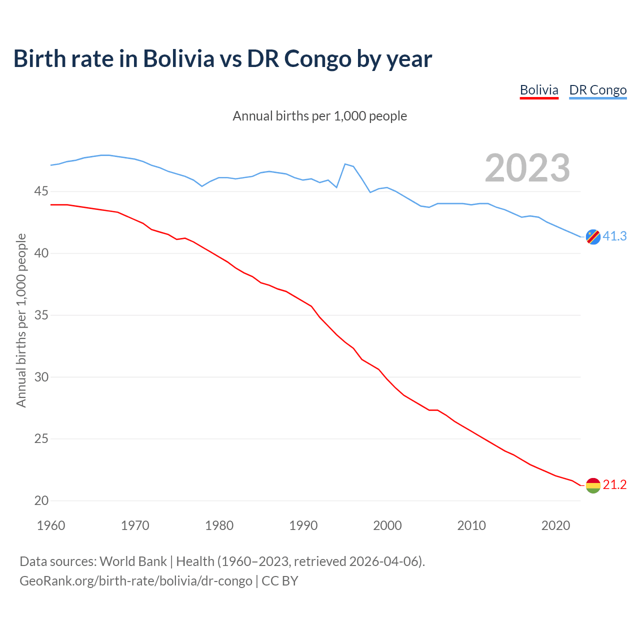 Bolivia has an annual birth rate of 21.2 births per 1,000 people, compared to 41.3 for the DR Congo. The average number of children a woman is expected to have during her lifetime — the fertility rate, is 2.55 in Bolivia and 6.05 in the DR Congo — 137.6% difference.