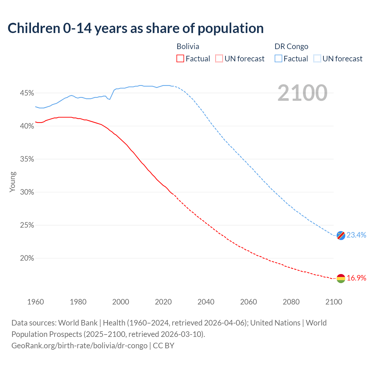 According to the latest available data on birth rates, the fertility rate in Bolivia was 2.55 children per woman in 2023, compared to 6.05 in the DR Congo in 2023. The replacement level is considered to be 2.1 children per woman.