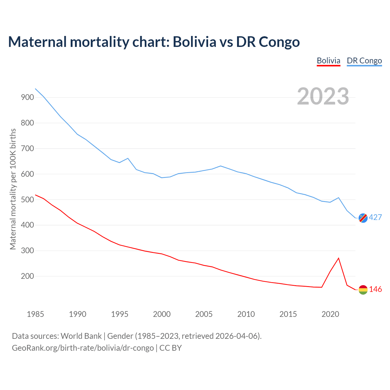 The maternal mortality rate, which is the probability of dying during childbirth or within 42 days of pregnancy termination, is 146 deaths per 100,000 live births in Bolivia, compared to 427 deaths in the DR Congo.