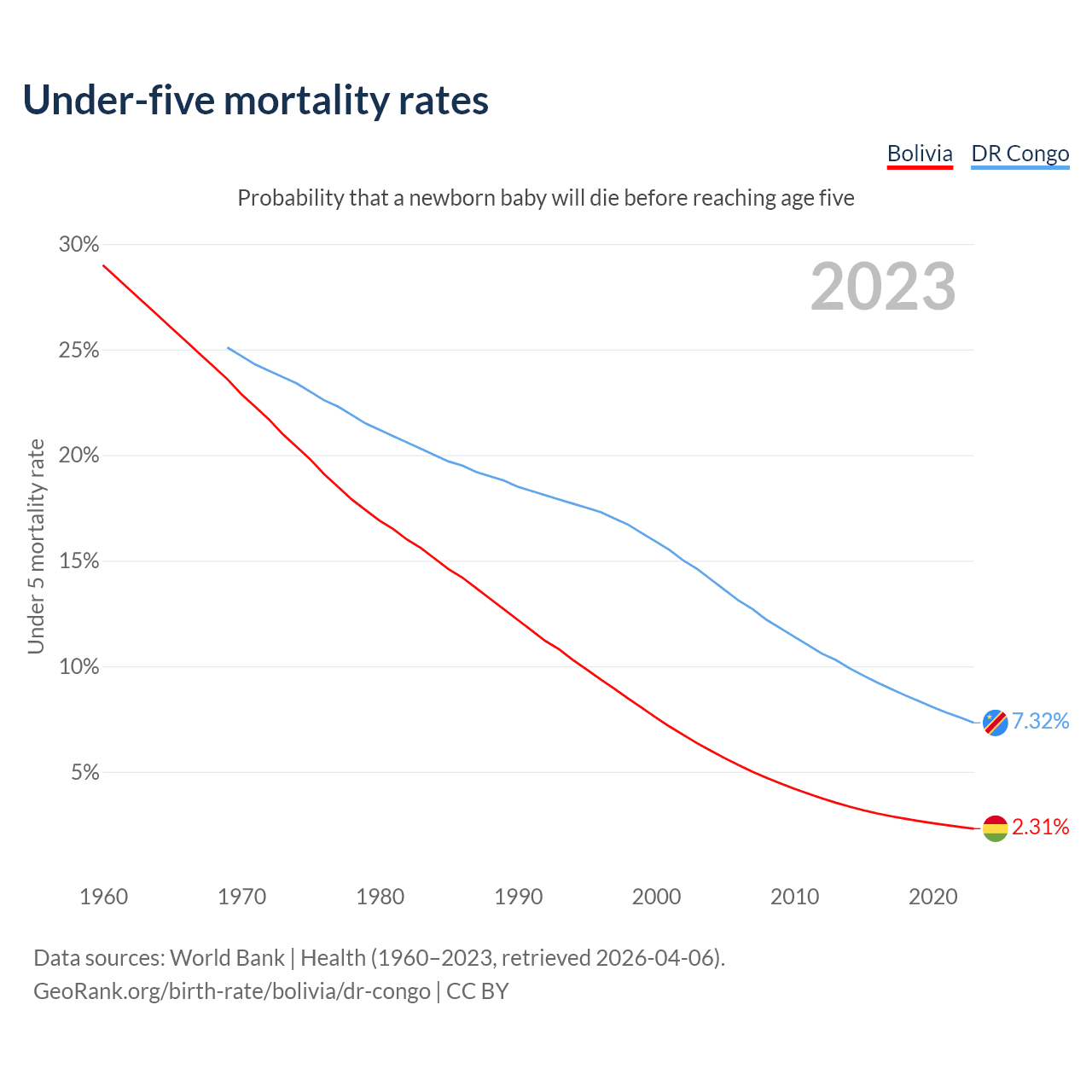 The chance that a newborn baby will die before reaching age five is 2.31% in Bolivia and 7.32% in the DR Congo. Above is a chart with historical data on under-five mortality rates.
