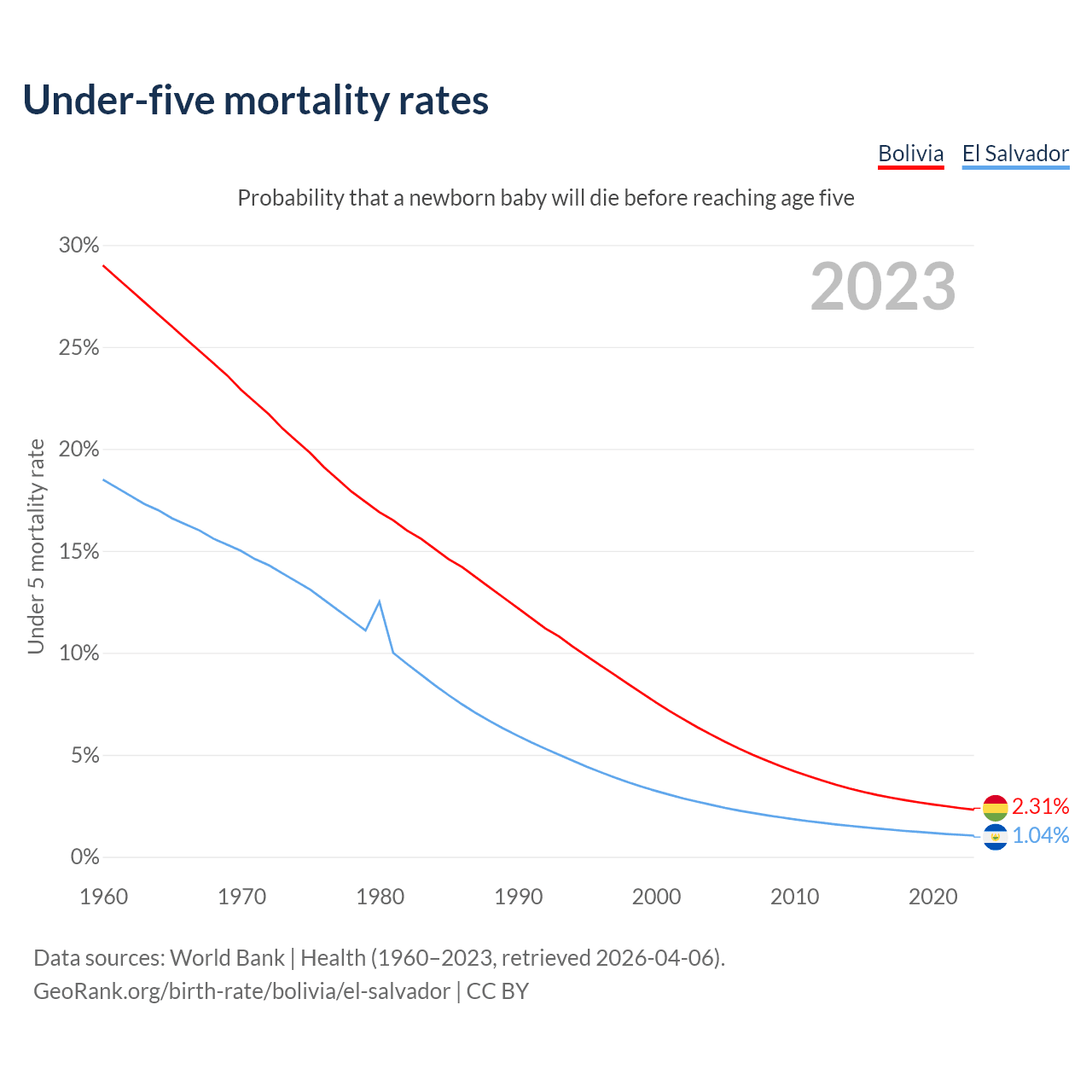 The chance that a newborn baby will die before reaching age five is 2.31% in Bolivia and 1.04% in El Salvador. Above is a chart with historical data on under-five mortality rates.