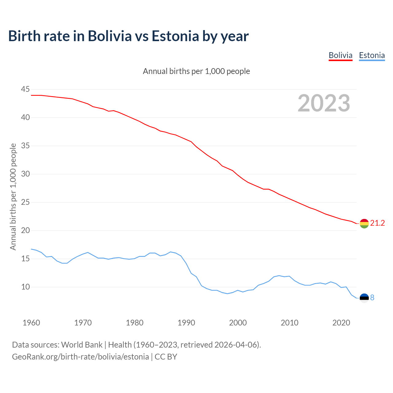 Bolivia has an annual birth rate of 21.2 births per 1,000 people, compared to 8 for Estonia. The average number of children a woman is expected to have during her lifetime — the fertility rate, is 2.55 in Bolivia and 1.31 in Estonia — 48.6% difference.