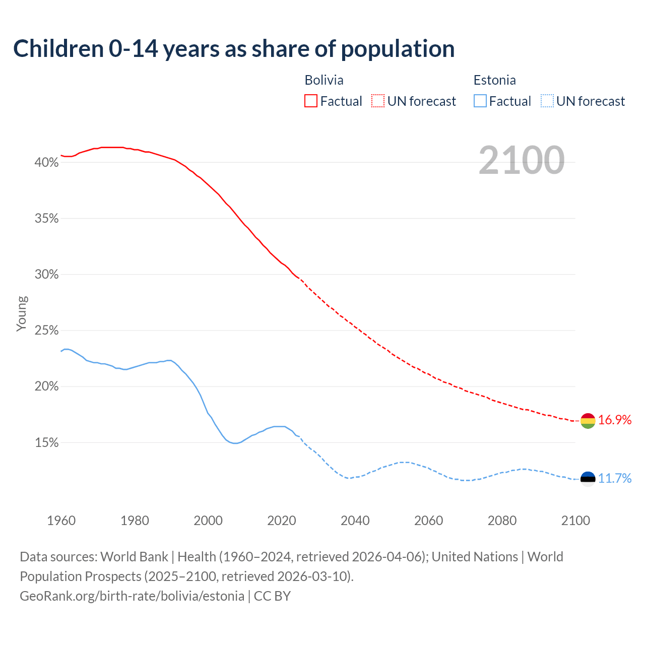 According to the latest available data on birth rates, the fertility rate in Bolivia was 2.55 children per woman in 2023, compared to 1.31 in Estonia in 2023. The replacement level is considered to be 2.1 children per woman.