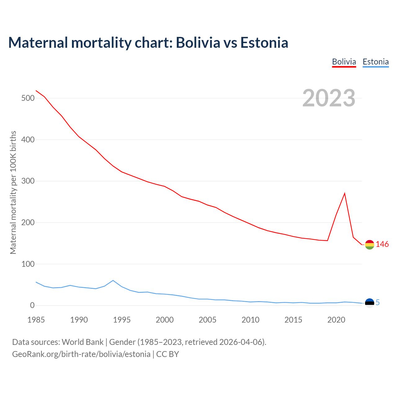 The maternal mortality rate, which is the probability of dying during childbirth or within 42 days of pregnancy termination, is 146 deaths per 100,000 live births in Bolivia, compared to 5 deaths in Estonia.