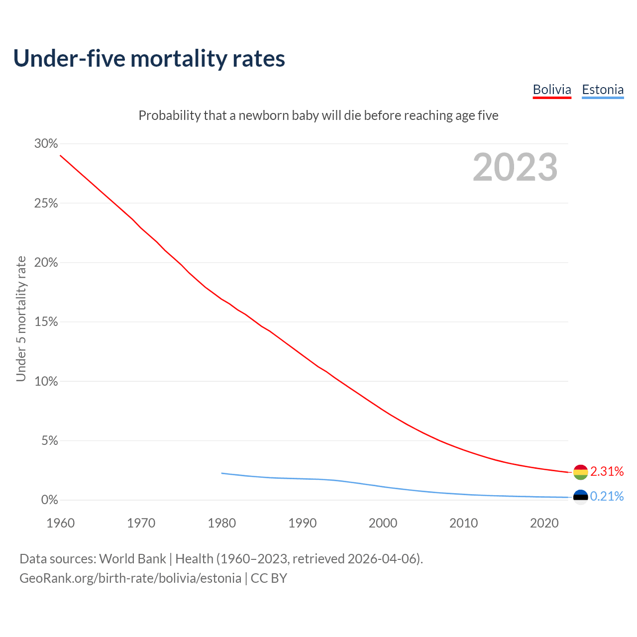 The chance that a newborn baby will die before reaching age five is 2.31% in Bolivia and 0.21% in Estonia. Above is a chart with historical data on under-five mortality rates.