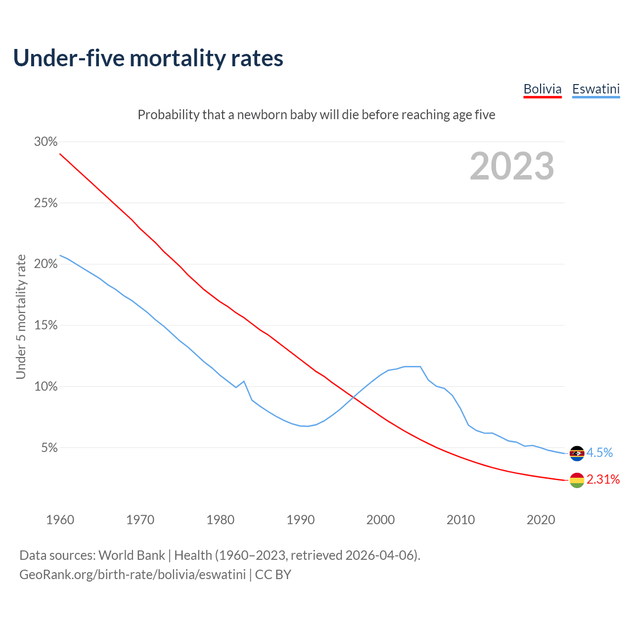 The chance that a newborn baby will die before reaching age five is 2.31% in Bolivia and 4.5% in Eswatini. Above is a chart with historical data on under-five mortality rates.