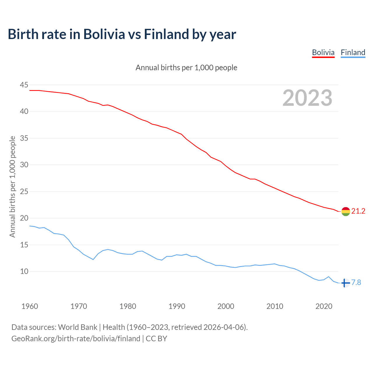 Bolivia has an annual birth rate of 21.2 births per 1,000 people, compared to 7.8 for Finland. The average number of children a woman is expected to have during her lifetime — the fertility rate, is 2.55 in Bolivia and 1.26 in Finland — 50.5% difference.