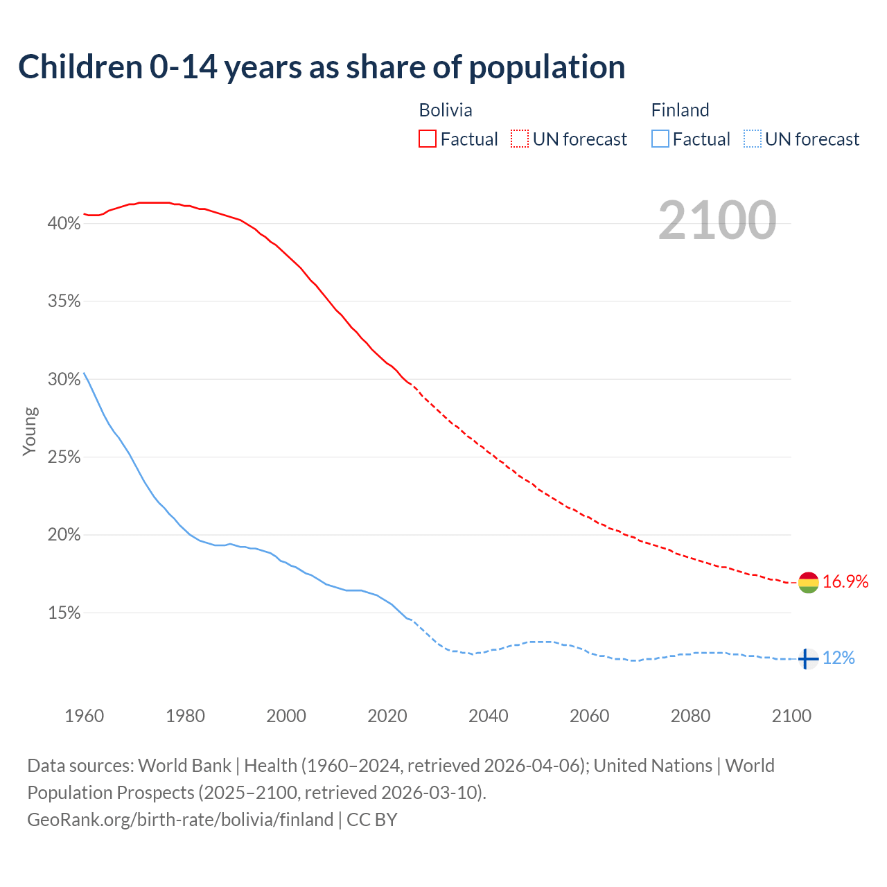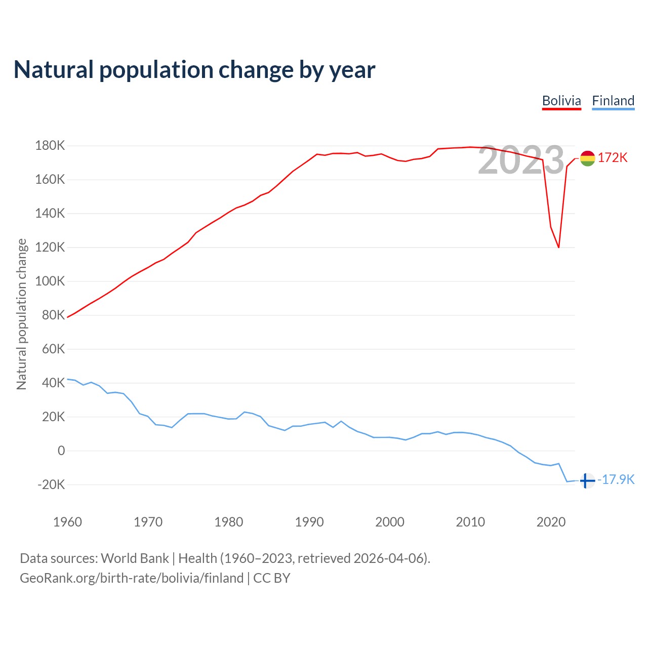 According to the latest available data on birth rates, the fertility rate in Bolivia was 2.55 children per woman in 2023, compared to 1.26 in Finland in 2023. The replacement level is considered to be 2.1 children per woman.