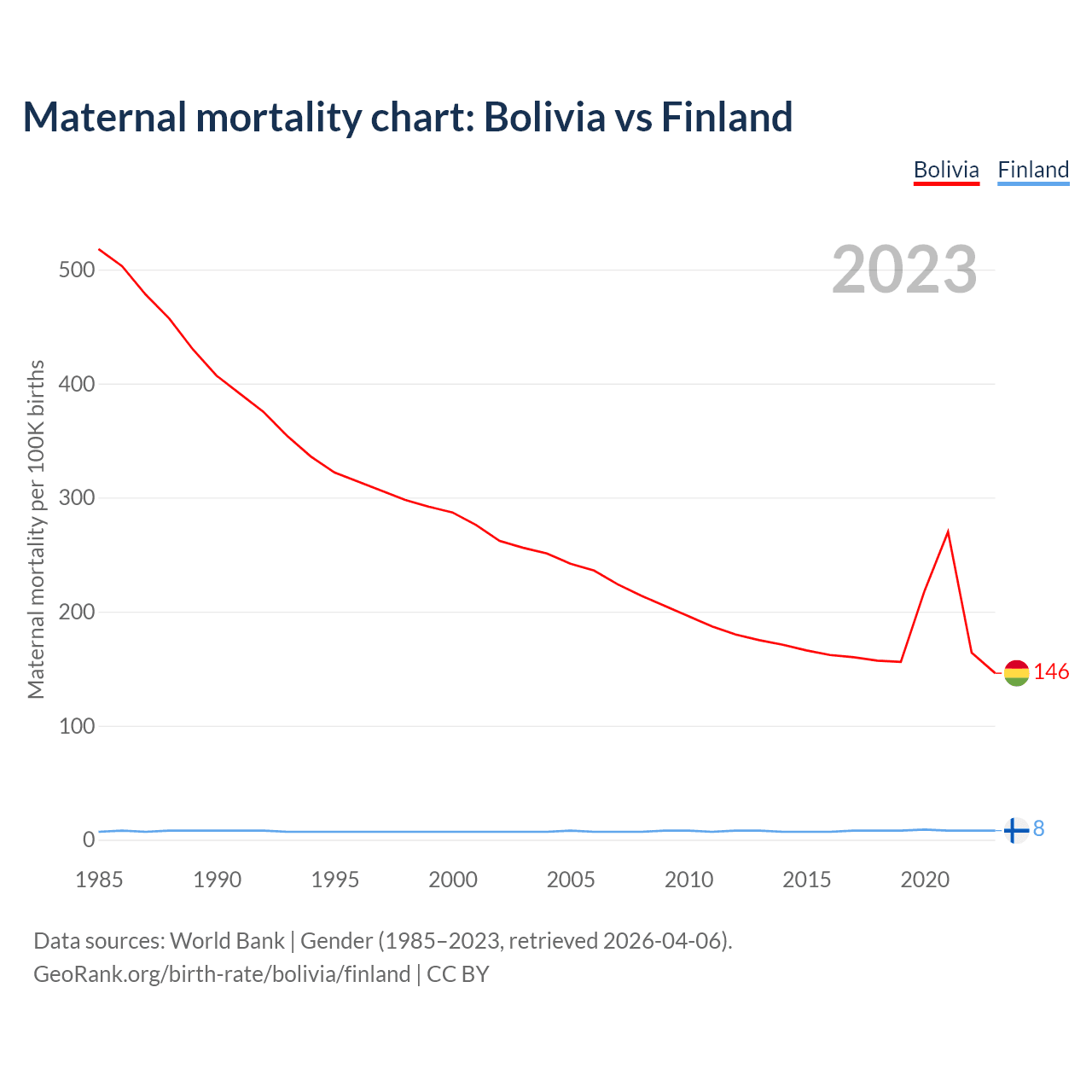 The maternal mortality rate, which is the probability of dying during childbirth or within 42 days of pregnancy termination, is 146 deaths per 100,000 live births in Bolivia, compared to 8 deaths in Finland.
