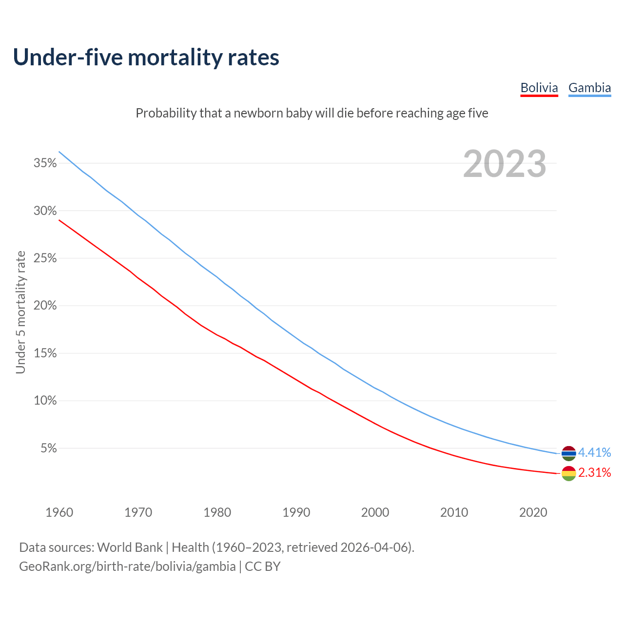 The chance that a newborn baby will die before reaching age five is 2.31% in Bolivia and 4.41% in the Gambia. Above is a chart with historical data on under-five mortality rates.
