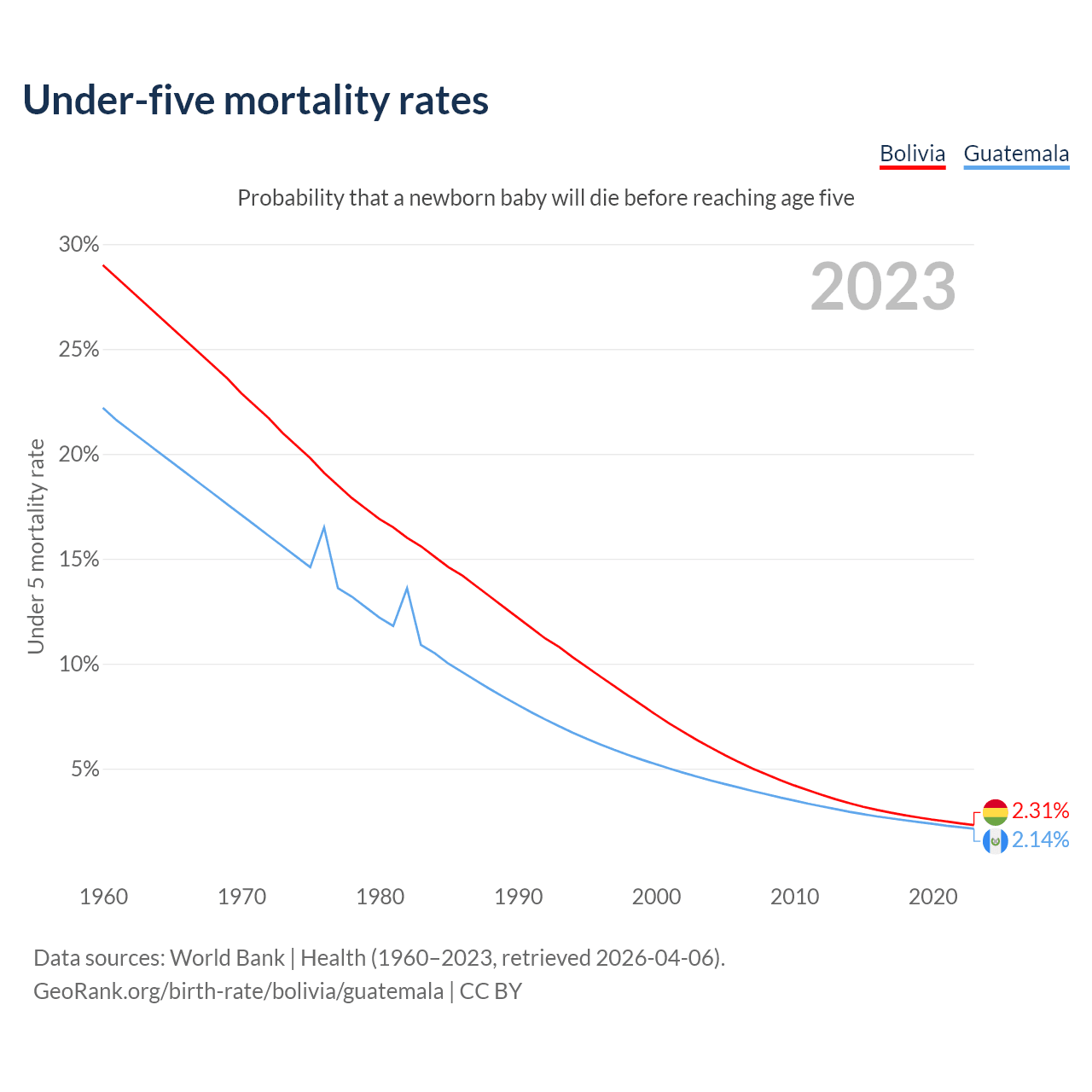 The chance that a newborn baby will die before reaching age five is 2.31% in Bolivia and 2.14% in Guatemala. Above is a chart with historical data on under-five mortality rates.