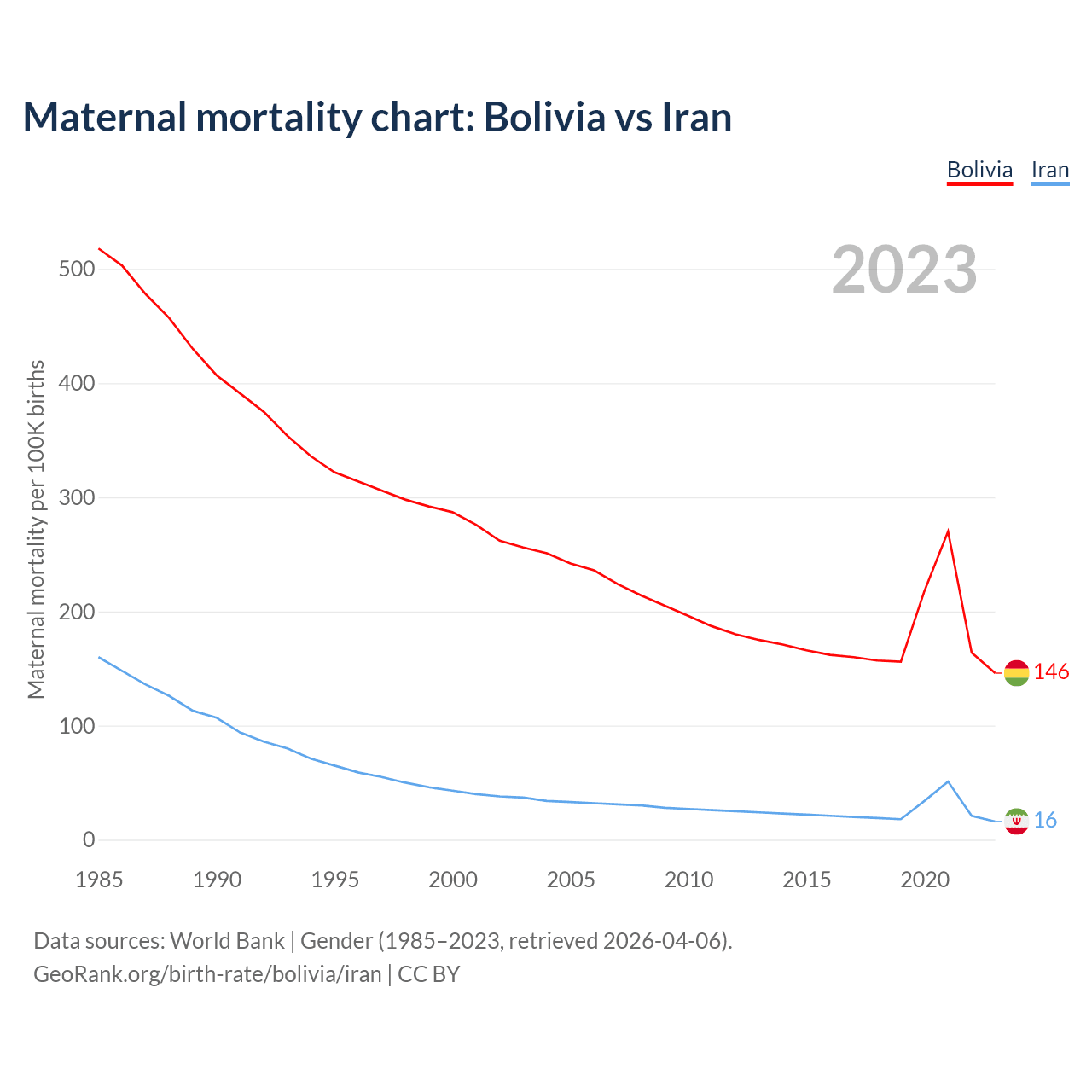 The maternal mortality rate, which is the probability of dying during childbirth or within 42 days of pregnancy termination, is 146 deaths per 100,000 live births in Bolivia, compared to 16 deaths in Iran.