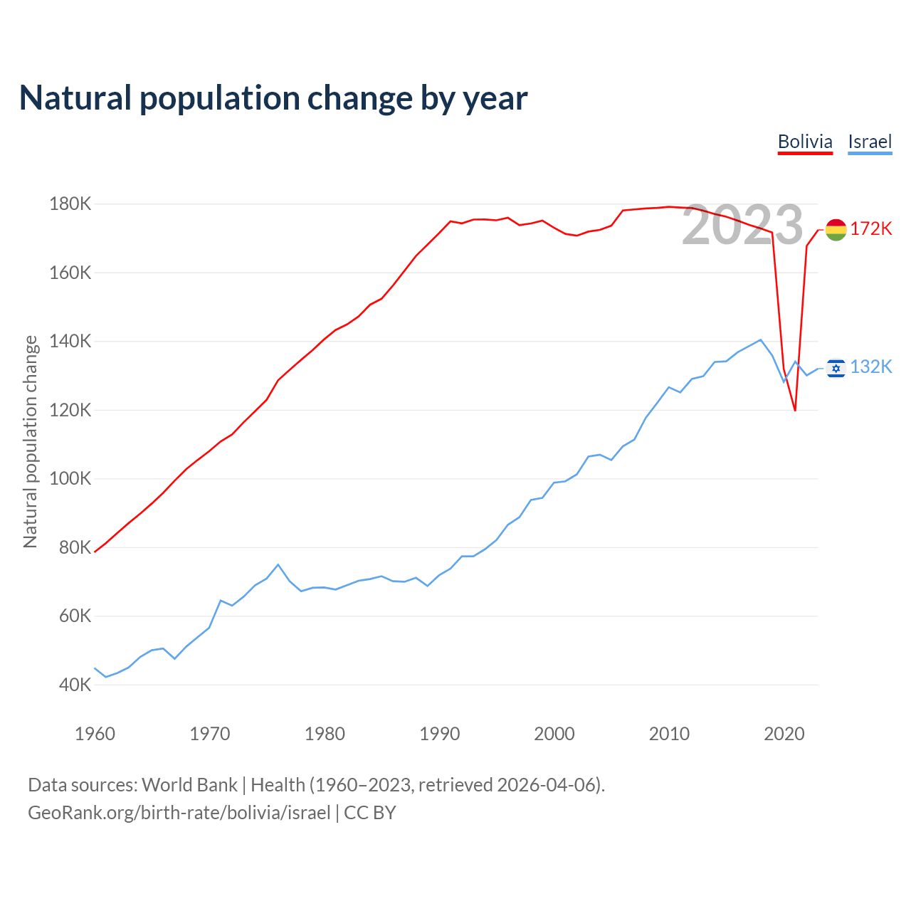 According to the latest available data on birth rates, the fertility rate in Bolivia was 2.55 children per woman in 2023, compared to 2.85 in Israel in 2023. The replacement level is considered to be 2.1 children per woman.