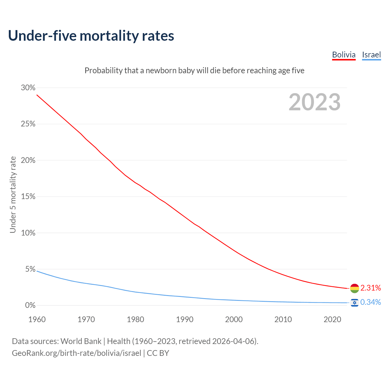 The chance that a newborn baby will die before reaching age five is 2.31% in Bolivia and 0.34% in Israel. Above is a chart with historical data on under-five mortality rates.