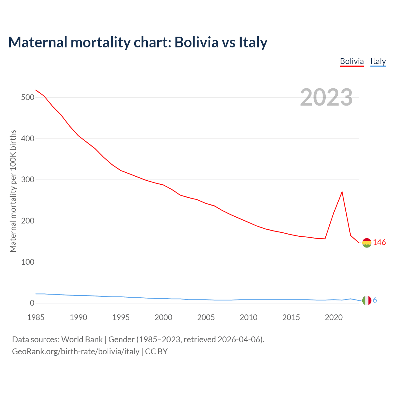The maternal mortality rate, which is the probability of dying during childbirth or within 42 days of pregnancy termination, is 146 deaths per 100,000 live births in Bolivia, compared to 6 deaths in Italy.