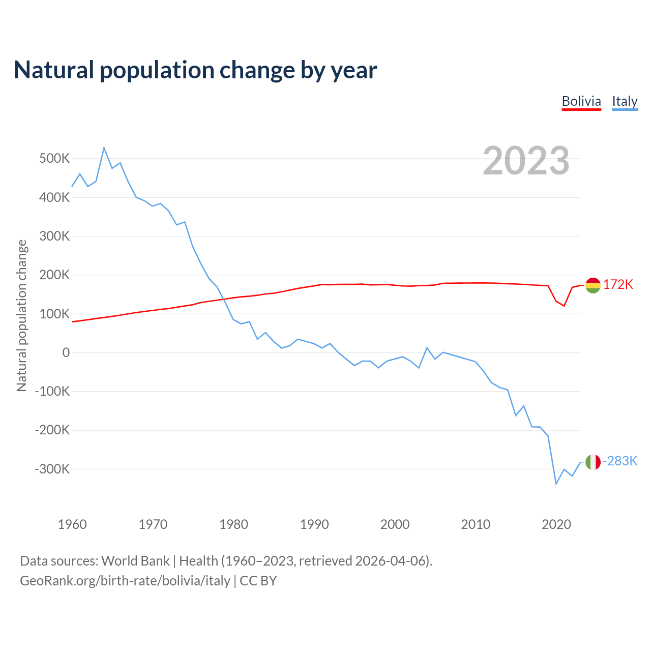 Bolivia has an annual birth rate of 21.2 births per 1,000 people, compared to 6.4 for Italy. The average number of children a woman is expected to have during her lifetime — the fertility rate, is 2.55 in Bolivia and 1.2 in Italy — 52.9% difference.