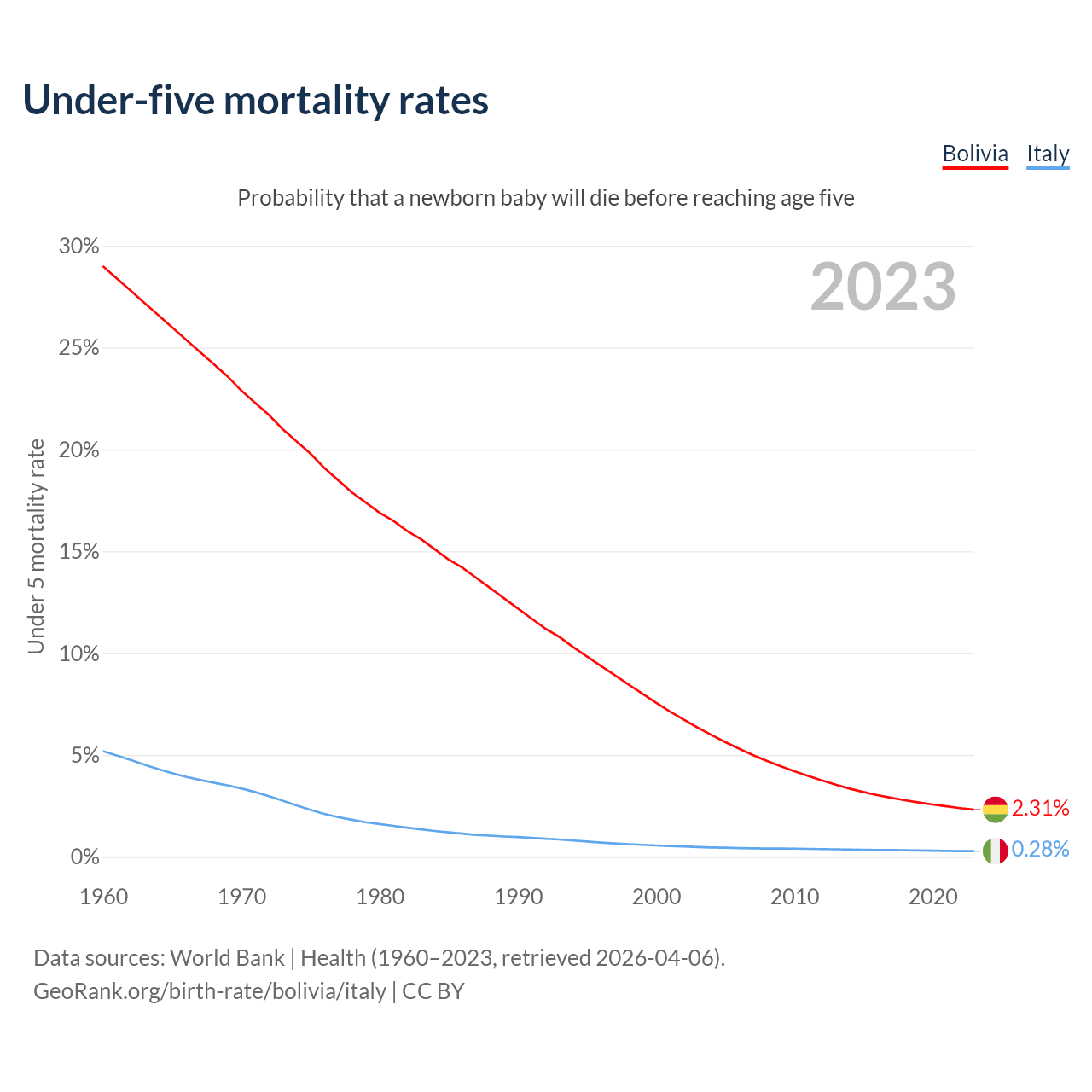 The chance that a newborn baby will die before reaching age five is 2.31% in Bolivia and 0.28% in Italy. Above is a chart with historical data on under-five mortality rates.