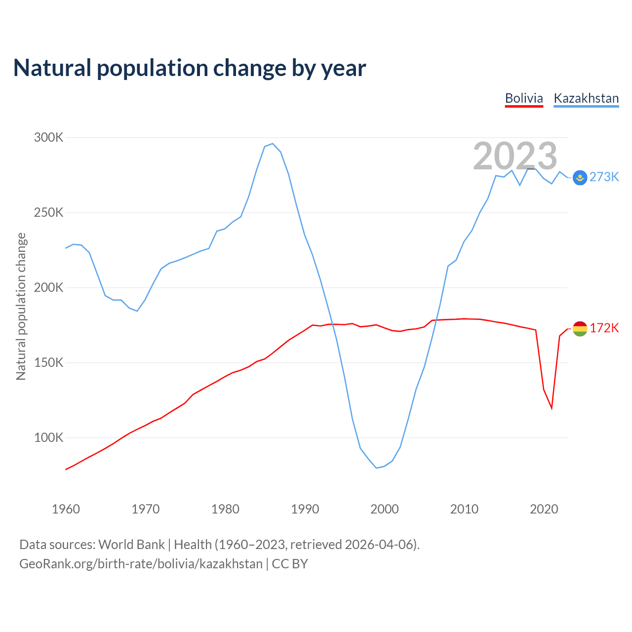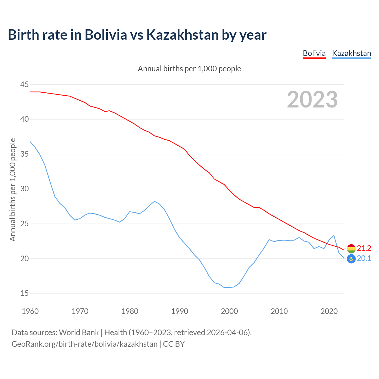 According to the latest available data on birth rates, the fertility rate in Bolivia was 2.55 children per woman in 2023, compared to 3.01 in Kazakhstan in 2023. The replacement level is considered to be 2.1 children per woman.