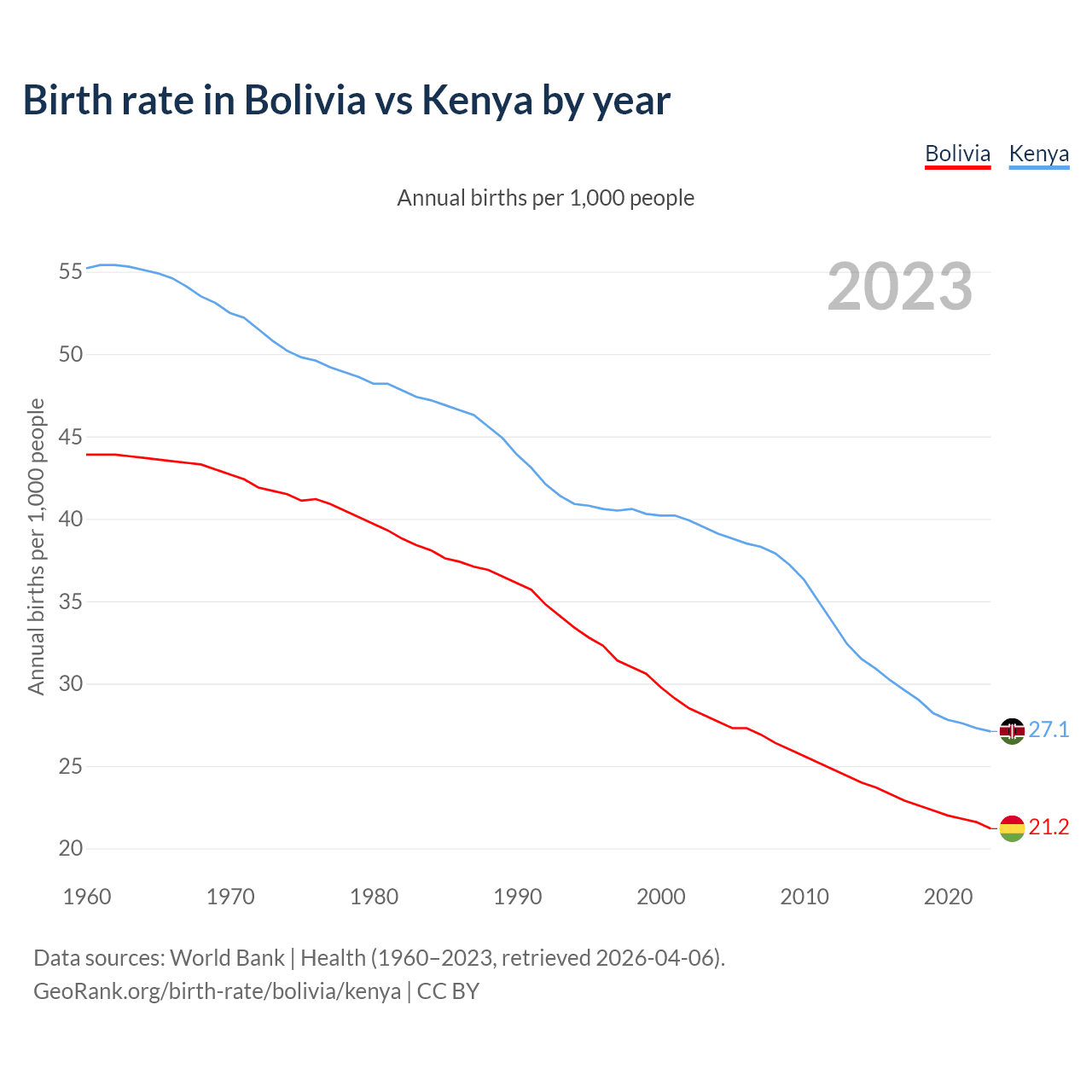 Bolivia has an annual birth rate of 21.2 births per 1,000 people, compared to 27.1 for Kenya. The average number of children a woman is expected to have during her lifetime — the fertility rate, is 2.55 in Bolivia and 3.21 in Kenya — 26% difference.