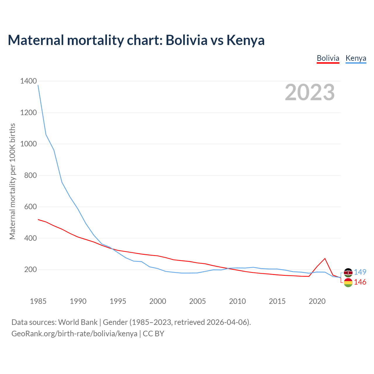 The maternal mortality rate, which is the probability of dying during childbirth or within 42 days of pregnancy termination, is 146 deaths per 100,000 live births in Bolivia, compared to 149 deaths in Kenya.