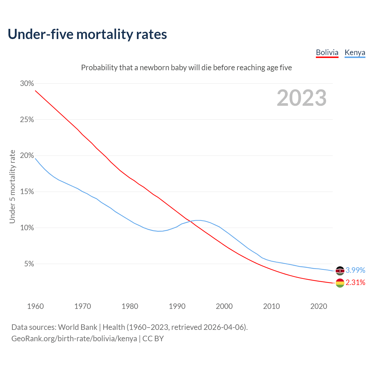 The chance that a newborn baby will die before reaching age five is 2.31% in Bolivia and 3.99% in Kenya. Above is a chart with historical data on under-five mortality rates.
