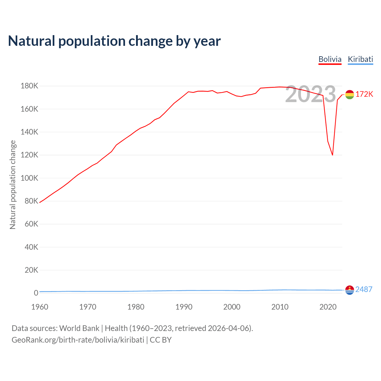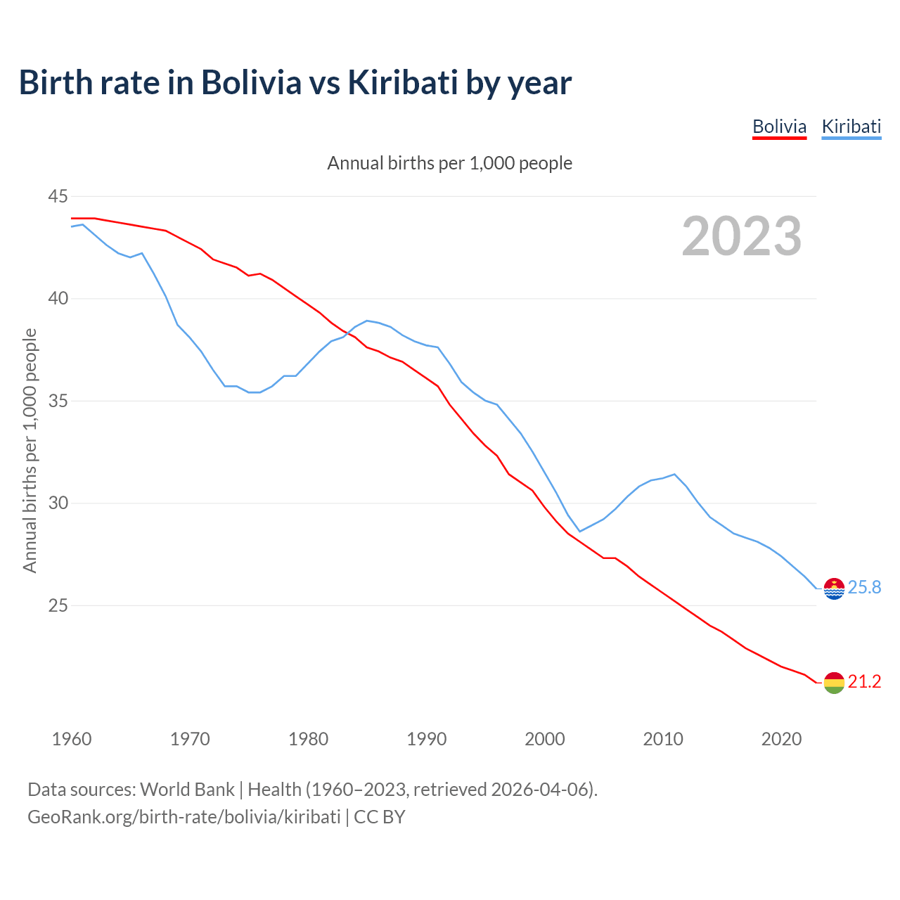 Bolivia has an annual birth rate of 21.2 births per 1,000 people, compared to 25.8 for Kiribati. The average number of children a woman is expected to have during her lifetime — the fertility rate, is 2.55 in Bolivia and 3.15 in Kiribati — 23.6% difference.