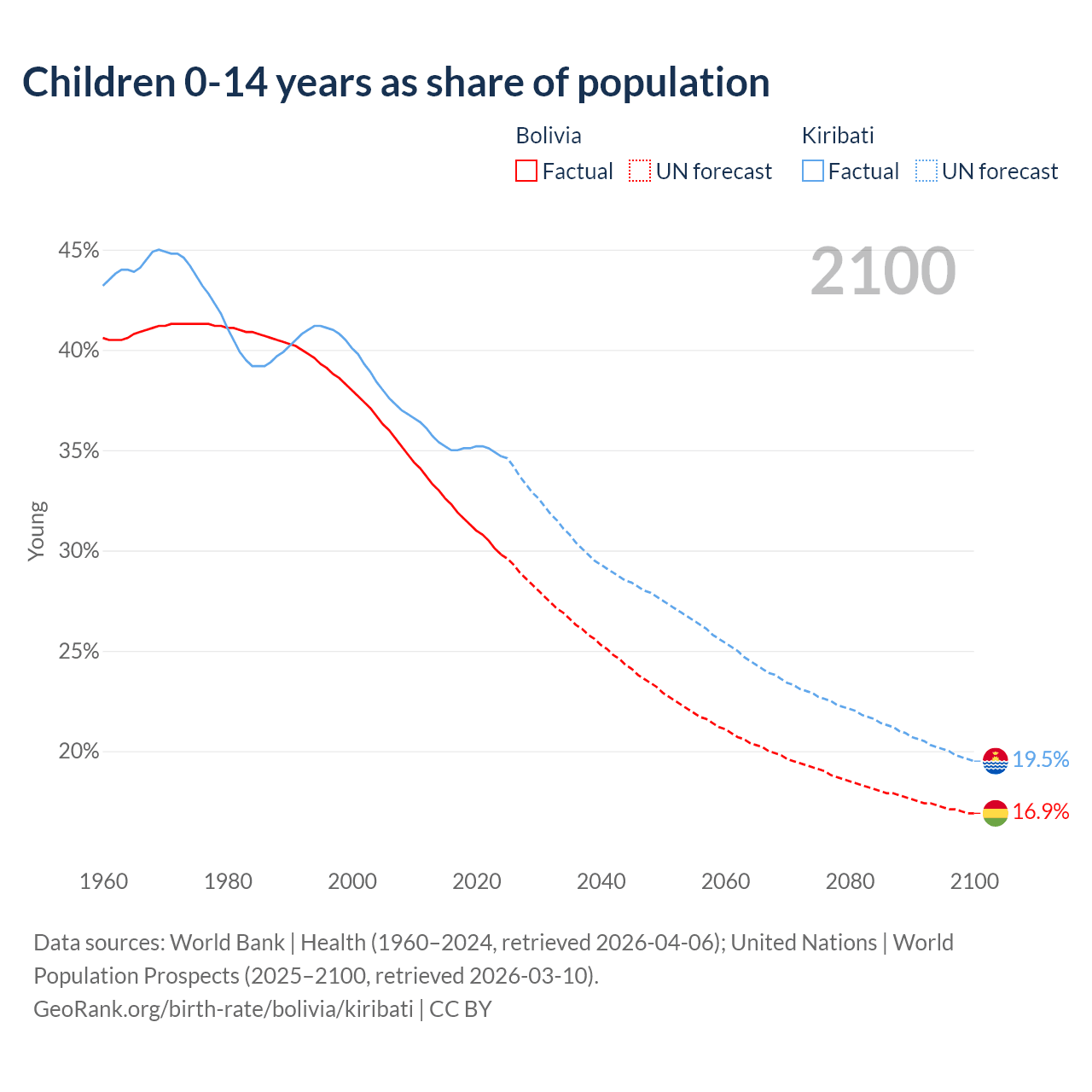 According to the latest available data on birth rates, the fertility rate in Bolivia was 2.55 children per woman in 2023, compared to 3.15 in Kiribati in 2023. The replacement level is considered to be 2.1 children per woman.