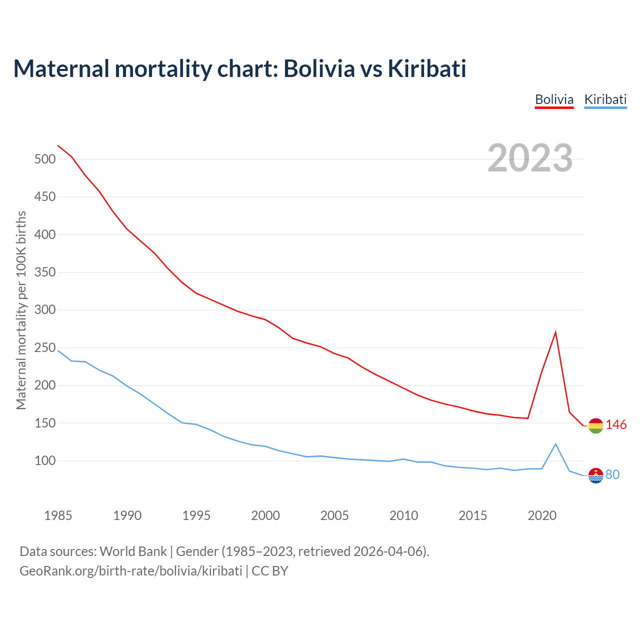 The maternal mortality rate, which is the probability of dying during childbirth or within 42 days of pregnancy termination, is 146 deaths per 100,000 live births in Bolivia, compared to 80 deaths in Kiribati.