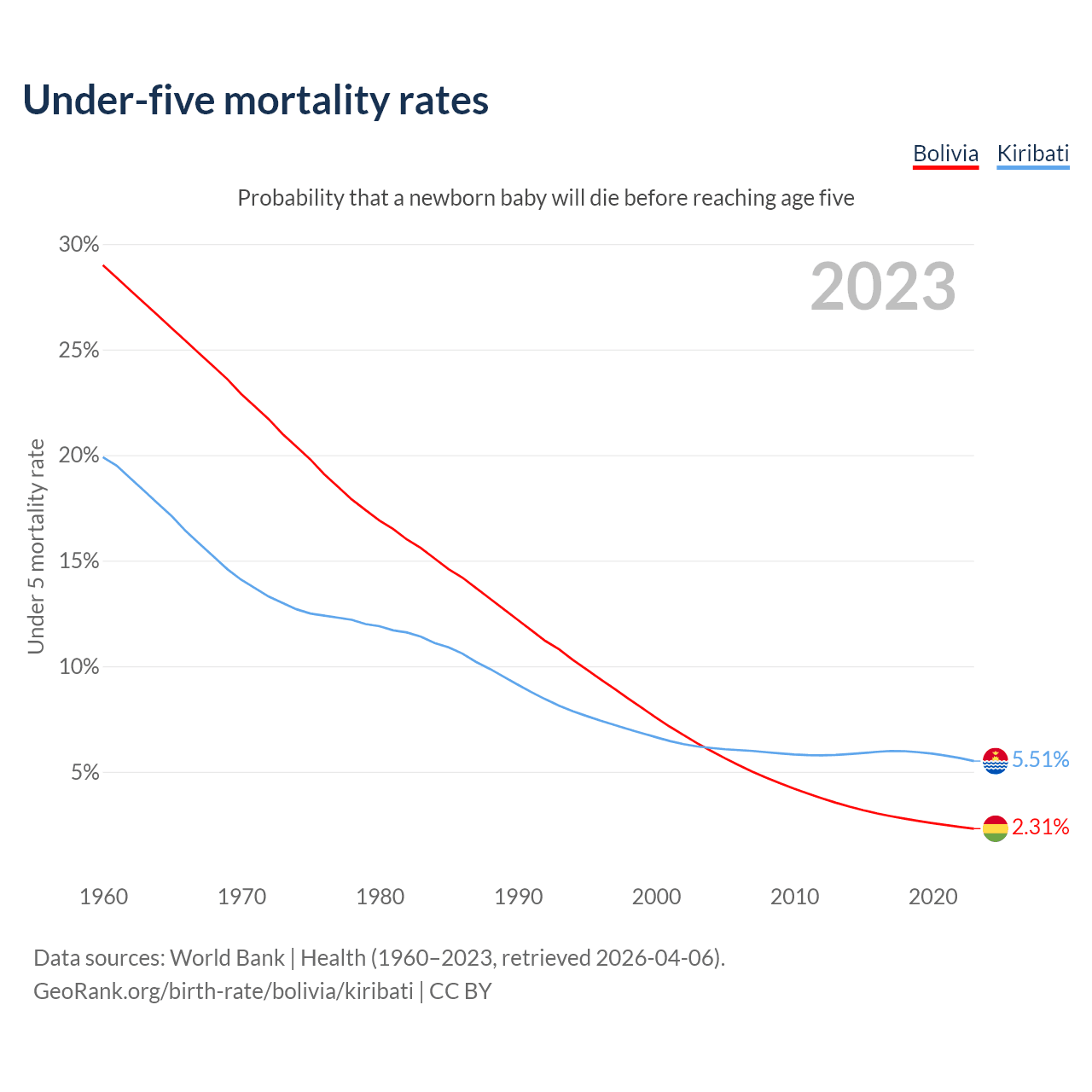 The chance that a newborn baby will die before reaching age five is 2.31% in Bolivia and 5.51% in Kiribati. Above is a chart with historical data on under-five mortality rates.