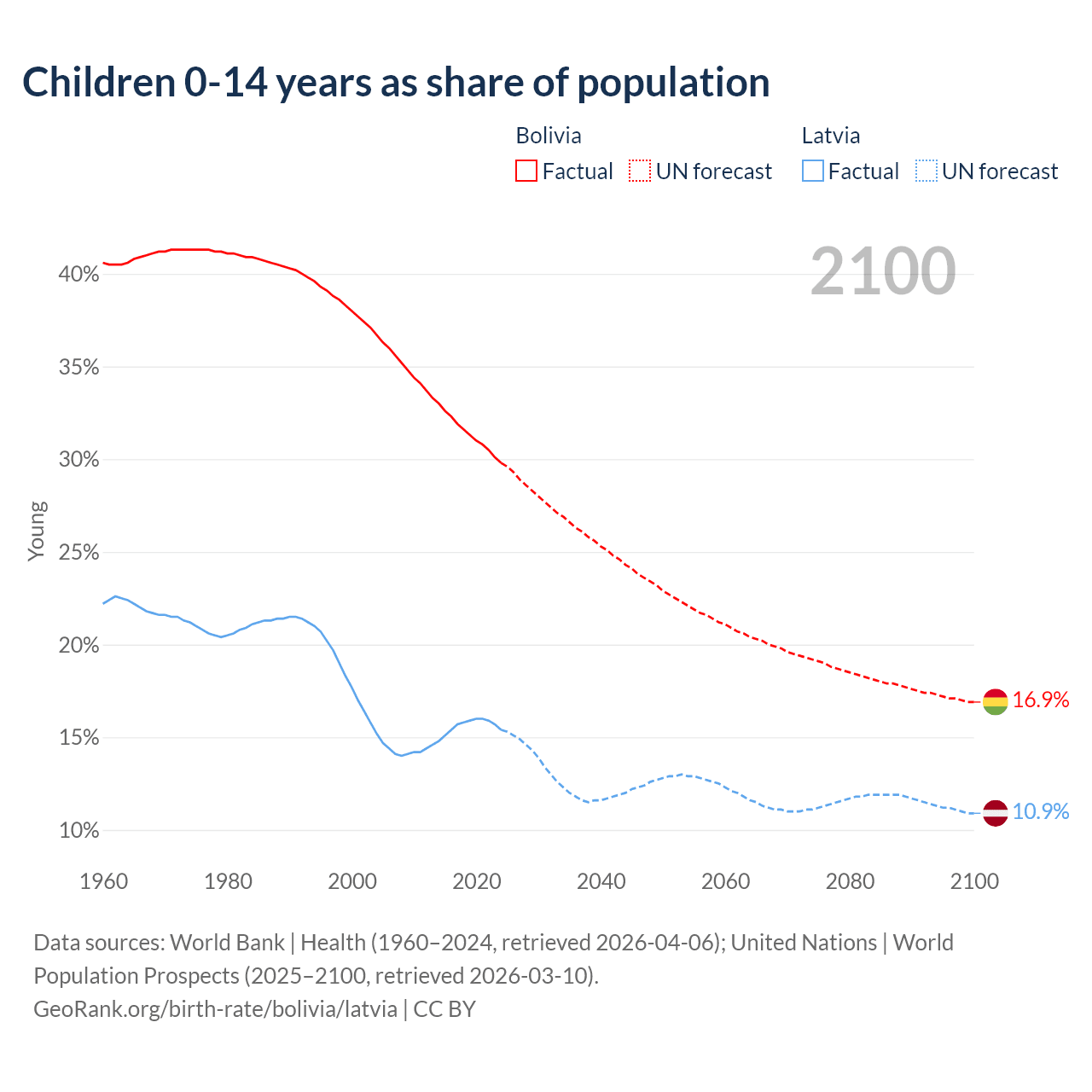 According to the latest available data on birth rates, the fertility rate in Bolivia was 2.55 children per woman in 2023, compared to 1.36 in Latvia in 2023. The replacement level is considered to be 2.1 children per woman.