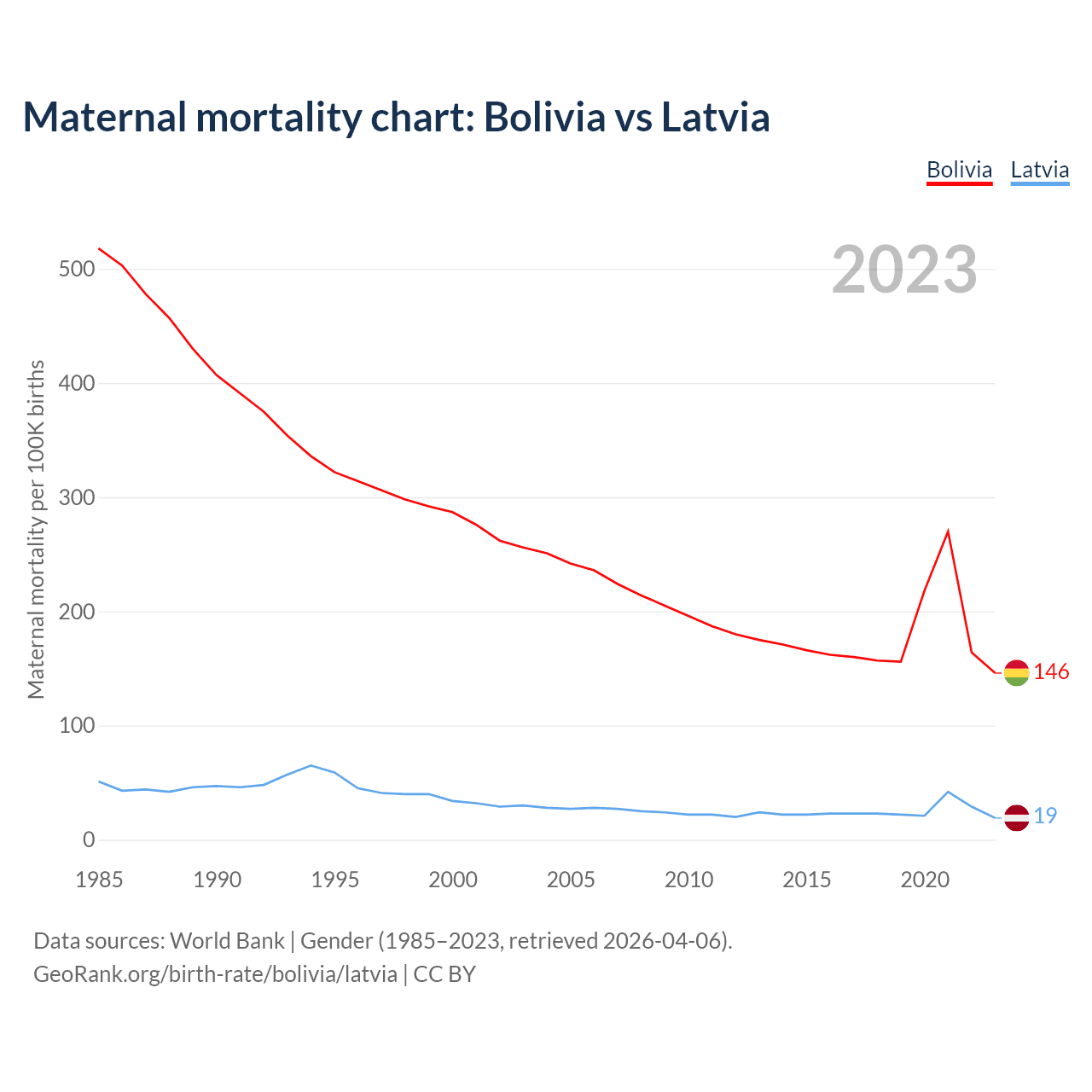 The maternal mortality rate, which is the probability of dying during childbirth or within 42 days of pregnancy termination, is 146 deaths per 100,000 live births in Bolivia, compared to 19 deaths in Latvia.