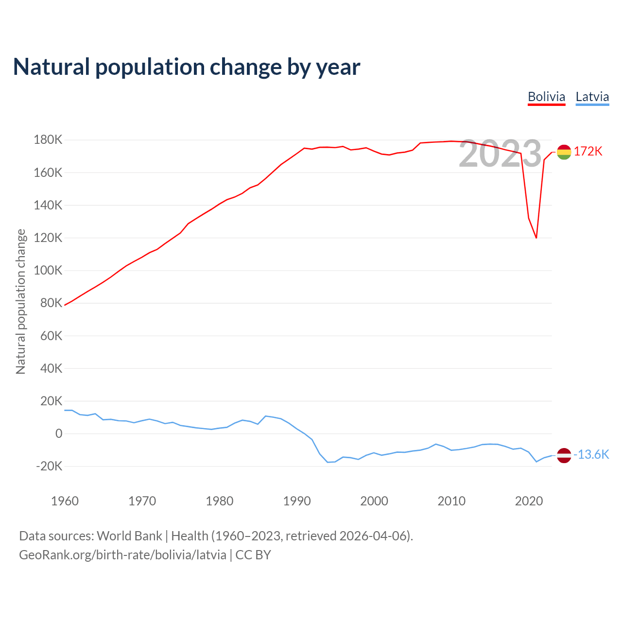 Bolivia has an annual birth rate of 21.2 births per 1,000 people, compared to 7.7 for Latvia. The average number of children a woman is expected to have during her lifetime — the fertility rate, is 2.55 in Bolivia and 1.36 in Latvia — 46.6% difference.