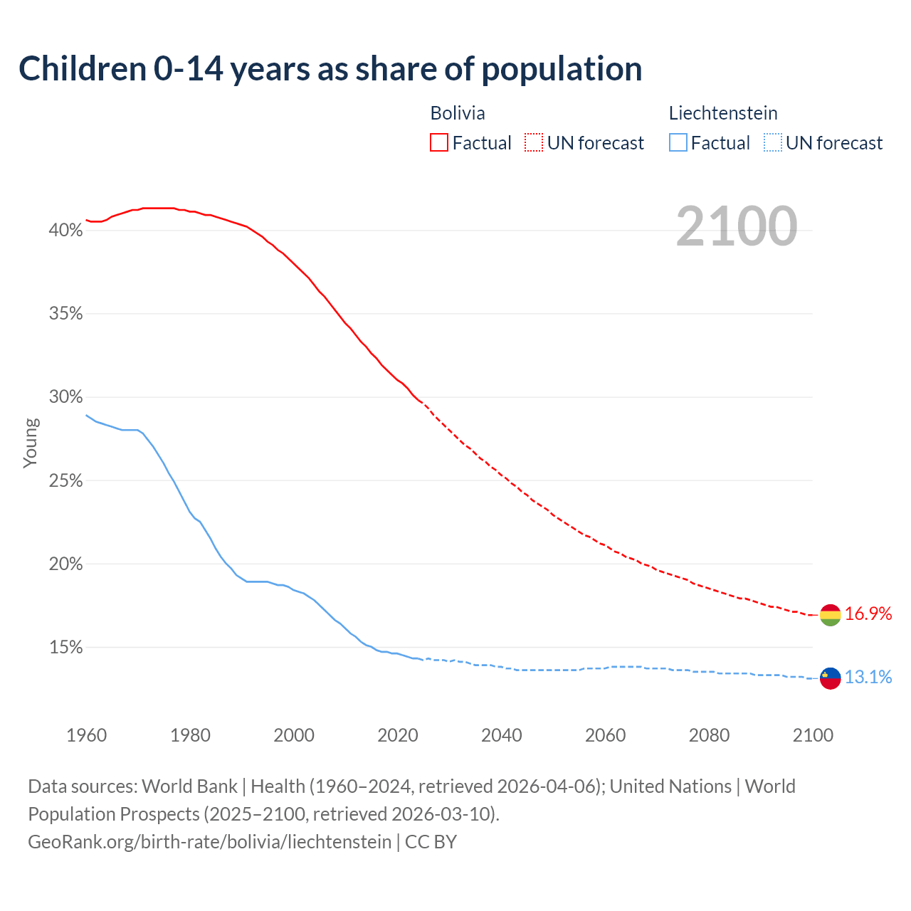Data sources: World Bank | Health (1960–2024, retrieved 2026-04-06); United Nations | World Population Prospects (2025–2100, retrieved 2026-03-10).