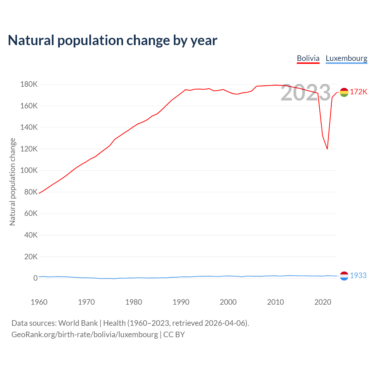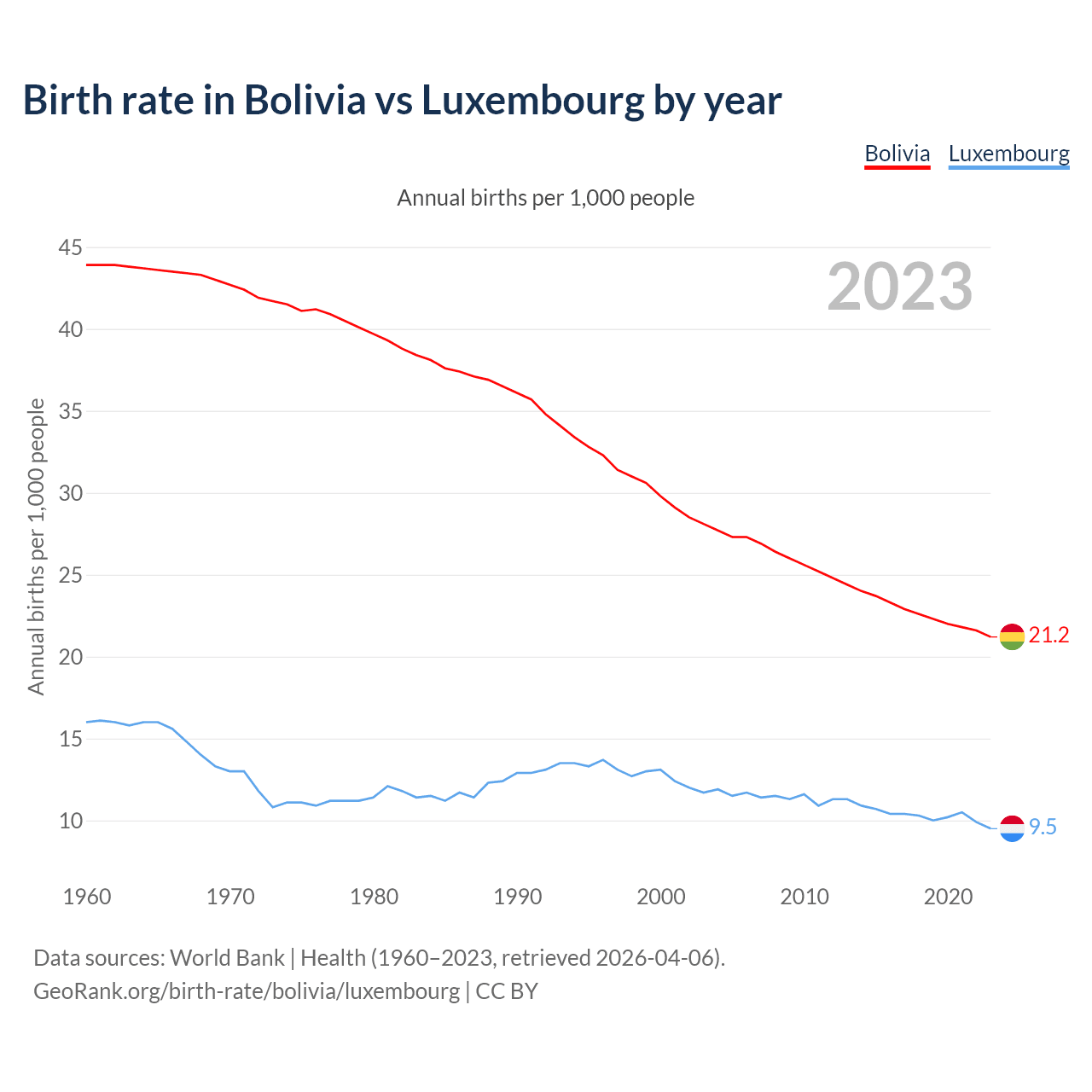 Bolivia has an annual birth rate of 21.2 births per 1,000 people, compared to 9.5 for Luxembourg. The average number of children a woman is expected to have during her lifetime — the fertility rate, is 2.55 in Bolivia and 1.25 in Luxembourg — 50.9% difference.