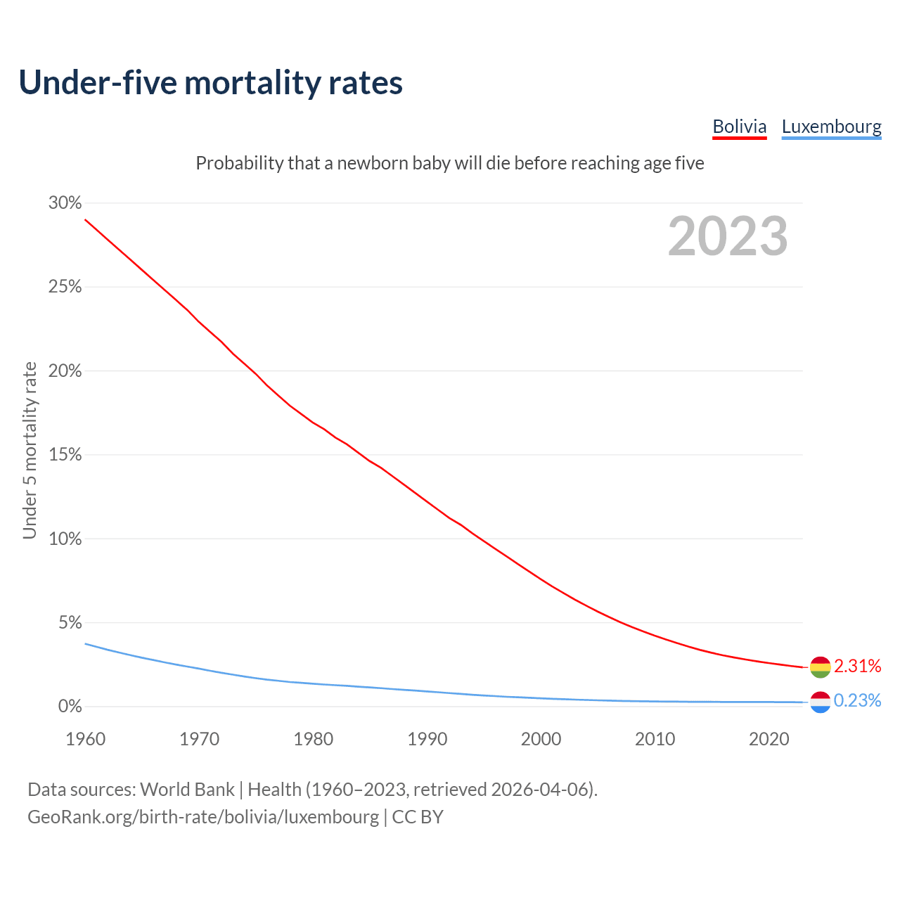 The chance that a newborn baby will die before reaching age five is 2.31% in Bolivia and 0.23% in Luxembourg. Above is a chart with historical data on under-five mortality rates.