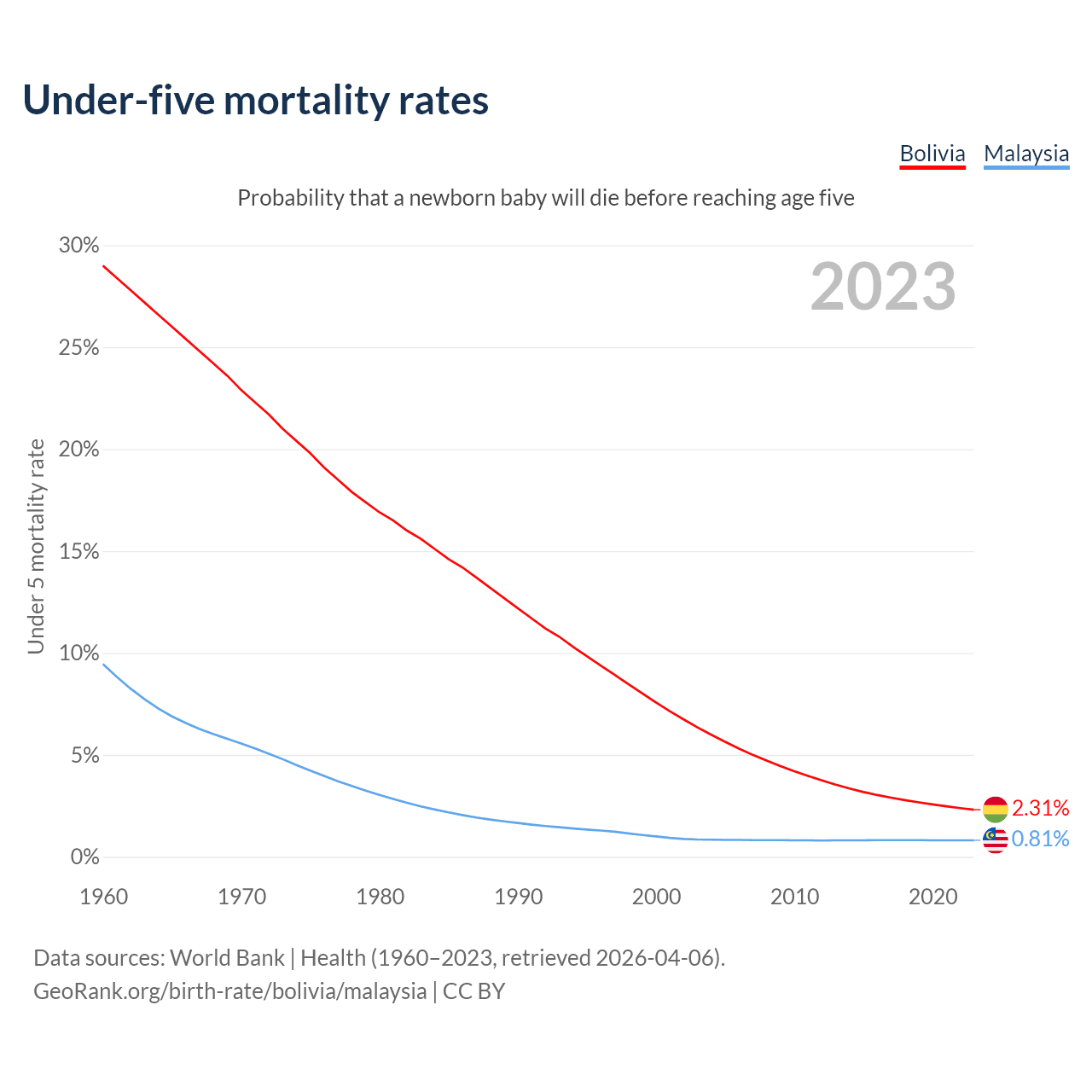 The chance that a newborn baby will die before reaching age five is 2.31% in Bolivia and 0.81% in Malaysia. Above is a chart with historical data on under-five mortality rates.