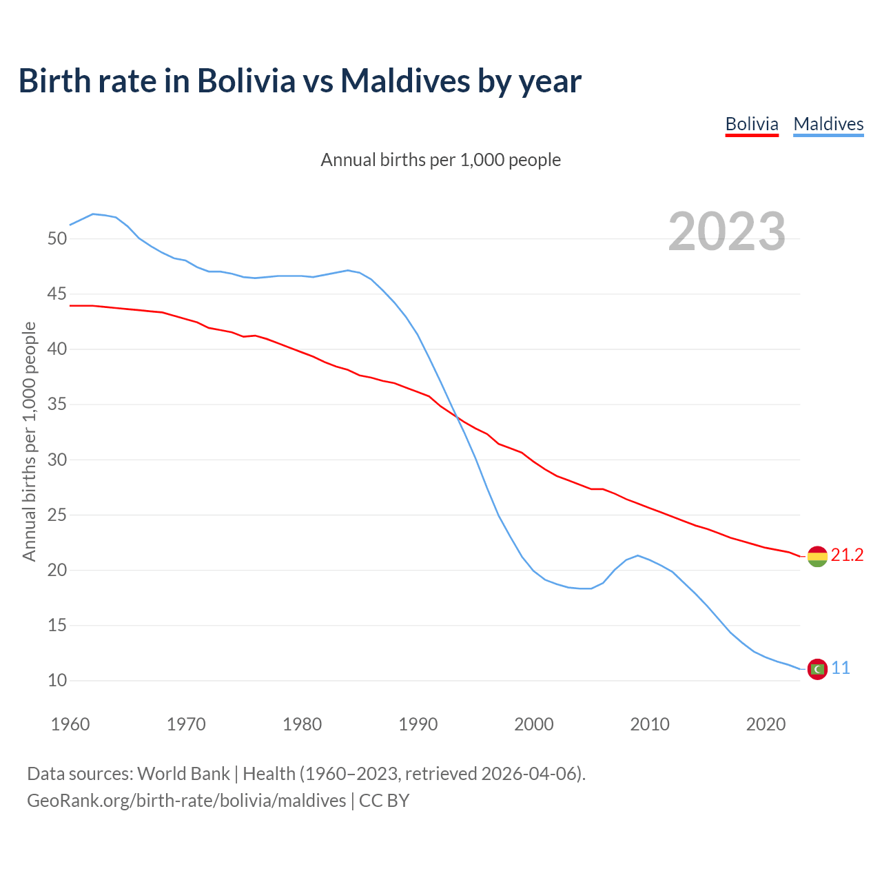Bolivia has an annual birth rate of 21.2 births per 1,000 people, compared to 11 for Maldives. The average number of children a woman is expected to have during her lifetime — the fertility rate, is 2.55 in Bolivia and 1.58 in Maldives — 38.2% difference.