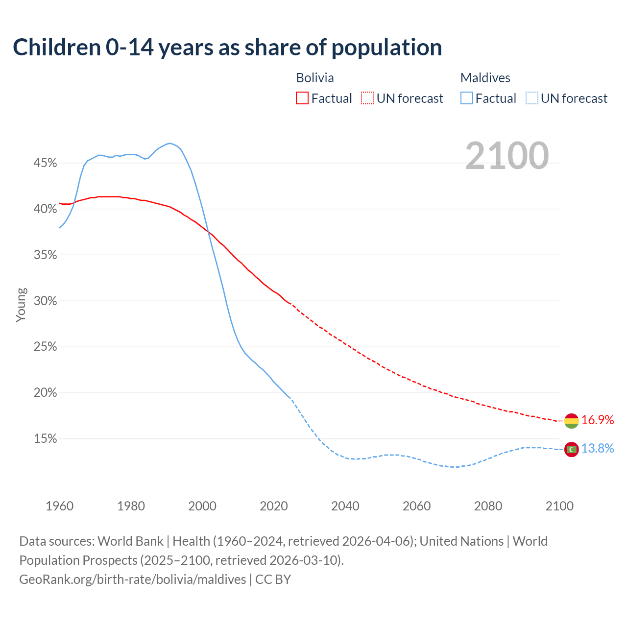 According to the latest available data on birth rates, the fertility rate in Bolivia was 2.55 children per woman in 2023, compared to 1.58 in Maldives in 2023. The replacement level is considered to be 2.1 children per woman.