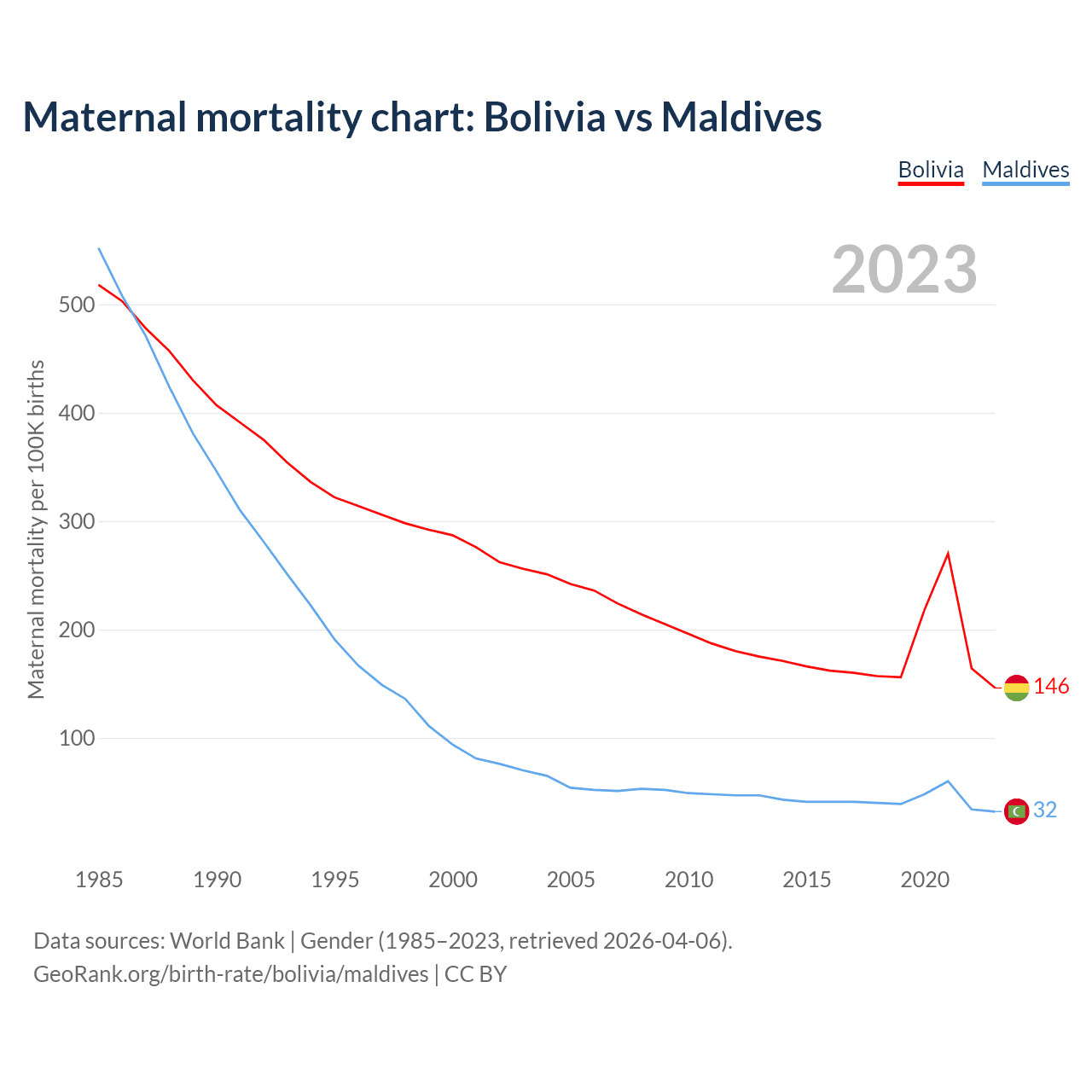 The maternal mortality rate, which is the probability of dying during childbirth or within 42 days of pregnancy termination, is 146 deaths per 100,000 live births in Bolivia, compared to 32 deaths in Maldives.