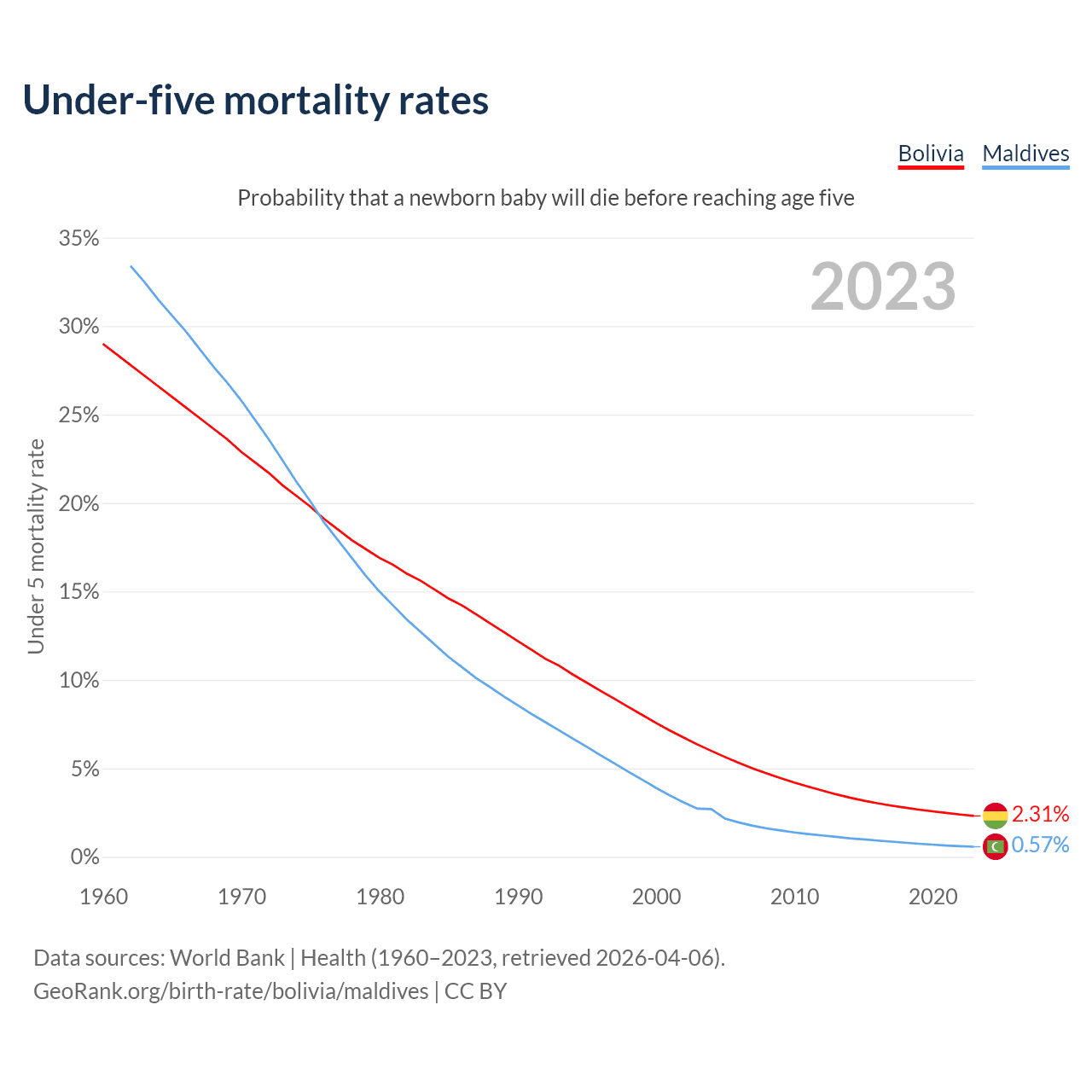 The chance that a newborn baby will die before reaching age five is 2.31% in Bolivia and 0.57% in Maldives. Above is a chart with historical data on under-five mortality rates.