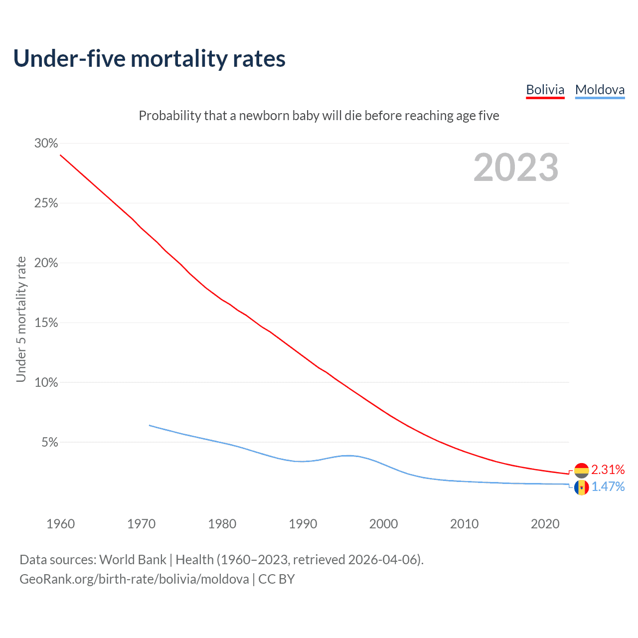 The chance that a newborn baby will die before reaching age five is 2.31% in Bolivia and 1.47% in Moldova. Above is a chart with historical data on under-five mortality rates.