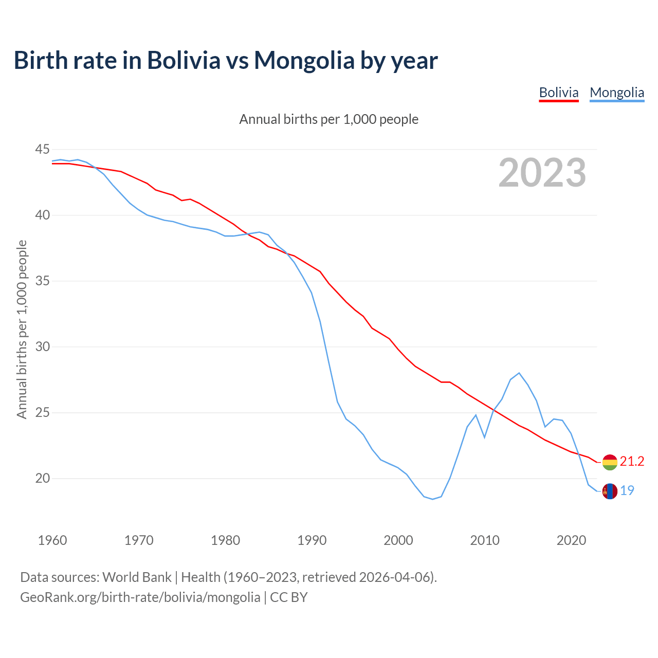 Bolivia has an annual birth rate of 21.2 births per 1,000 people, compared to 19 for Mongolia. The average number of children a woman is expected to have during her lifetime — the fertility rate, is 2.55 in Bolivia and 2.7 in Mongolia — 6.01% difference.