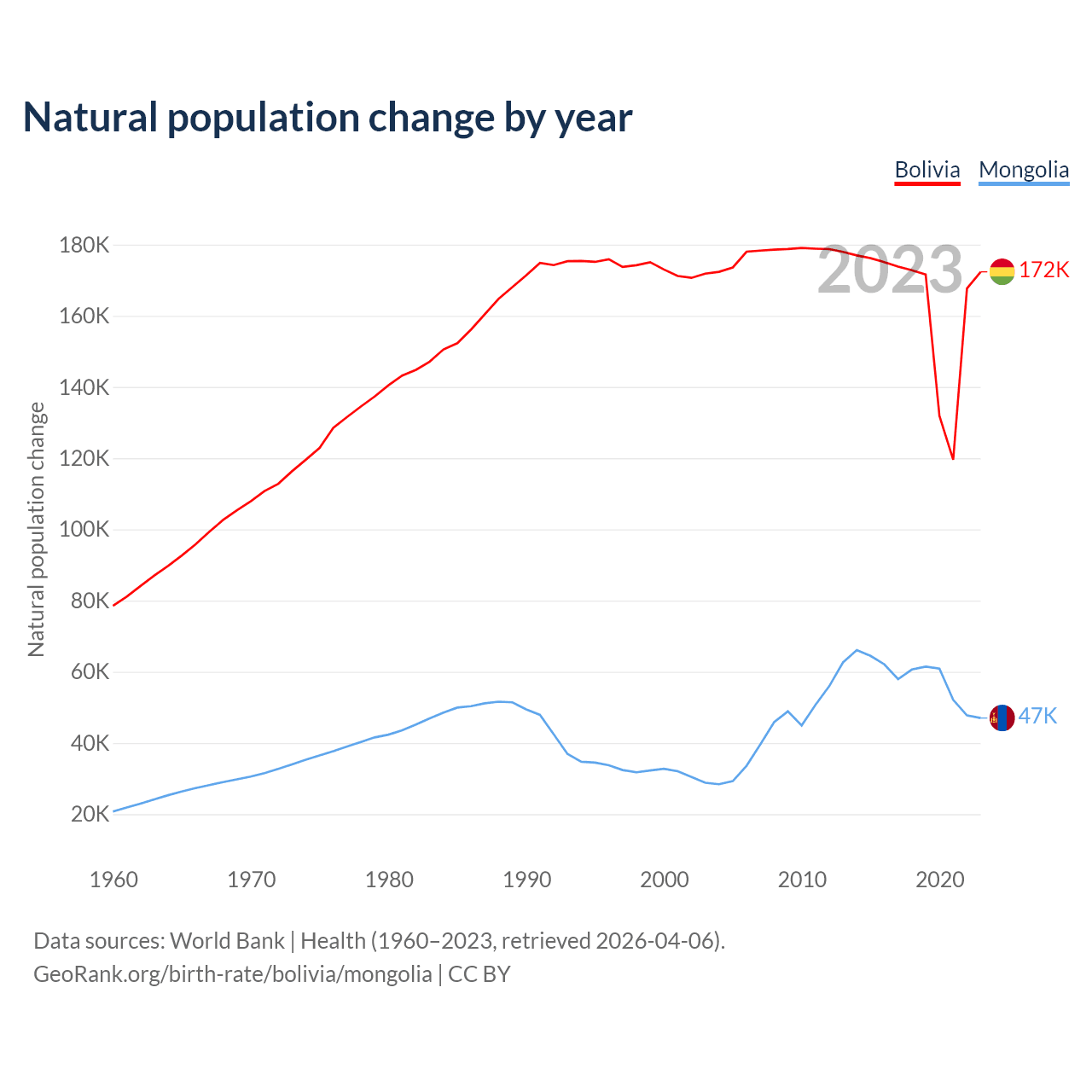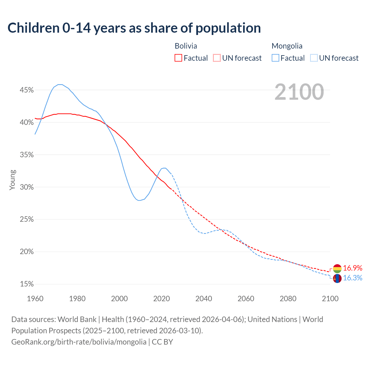According to the latest available data on birth rates, the fertility rate in Bolivia was 2.55 children per woman in 2023, compared to 2.7 in Mongolia in 2023. The replacement level is considered to be 2.1 children per woman.