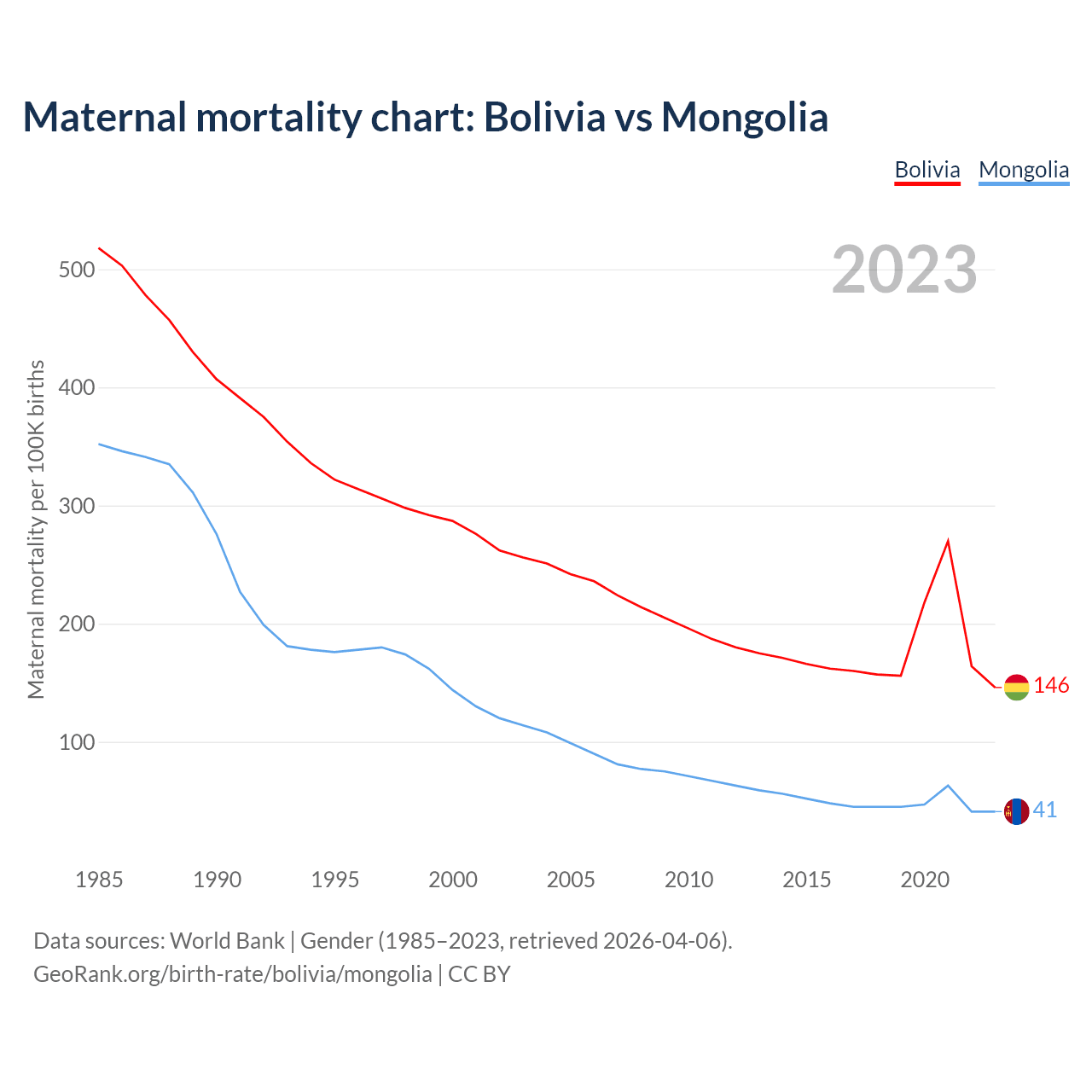 The maternal mortality rate, which is the probability of dying during childbirth or within 42 days of pregnancy termination, is 146 deaths per 100,000 live births in Bolivia, compared to 41 deaths in Mongolia.