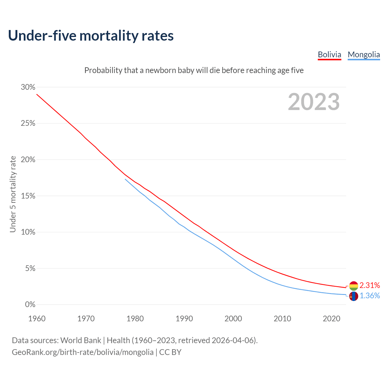 The chance that a newborn baby will die before reaching age five is 2.31% in Bolivia and 1.36% in Mongolia. Above is a chart with historical data on under-five mortality rates.