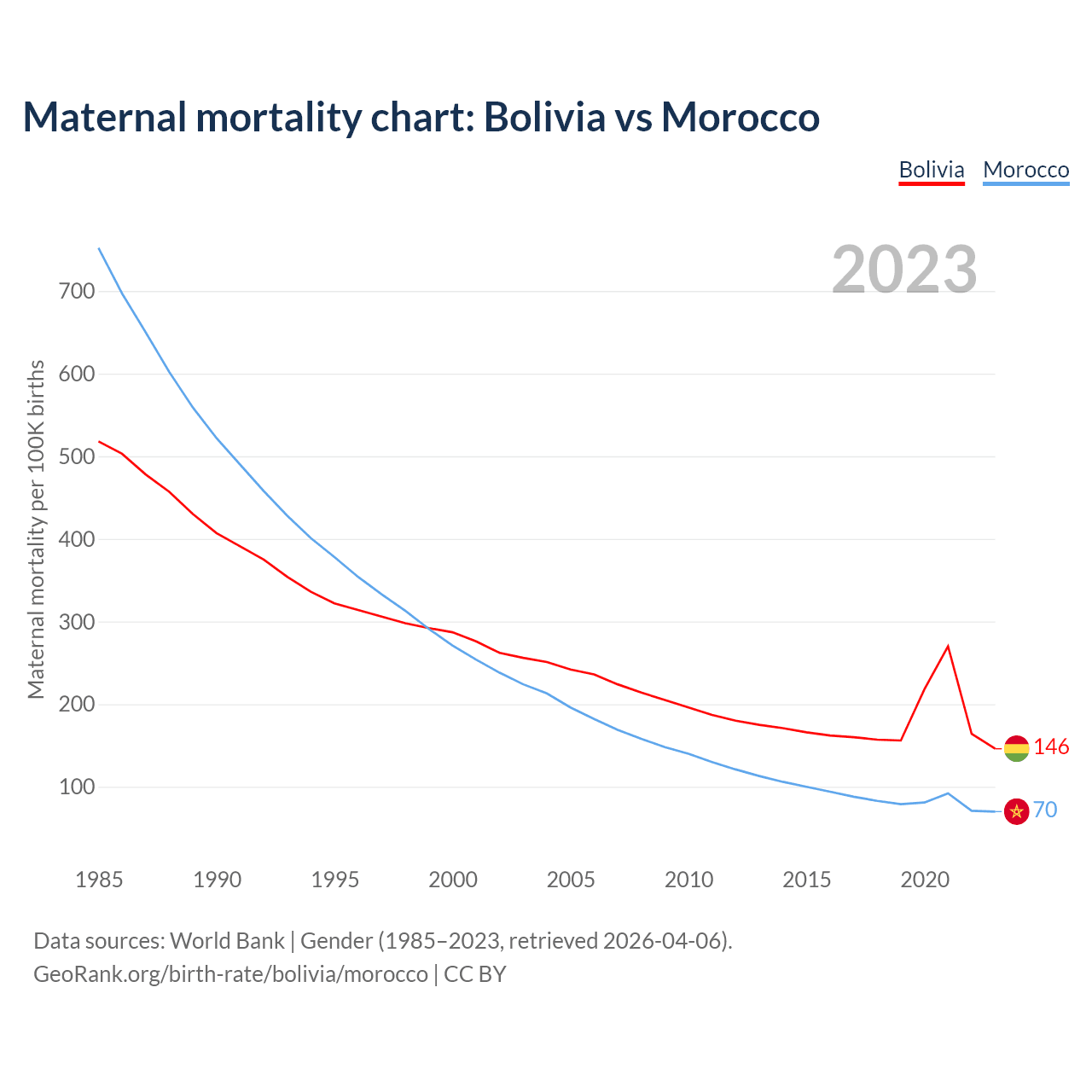 The maternal mortality rate, which is the probability of dying during childbirth or within 42 days of pregnancy termination, is 146 deaths per 100,000 live births in Bolivia, compared to 70 deaths in Morocco.